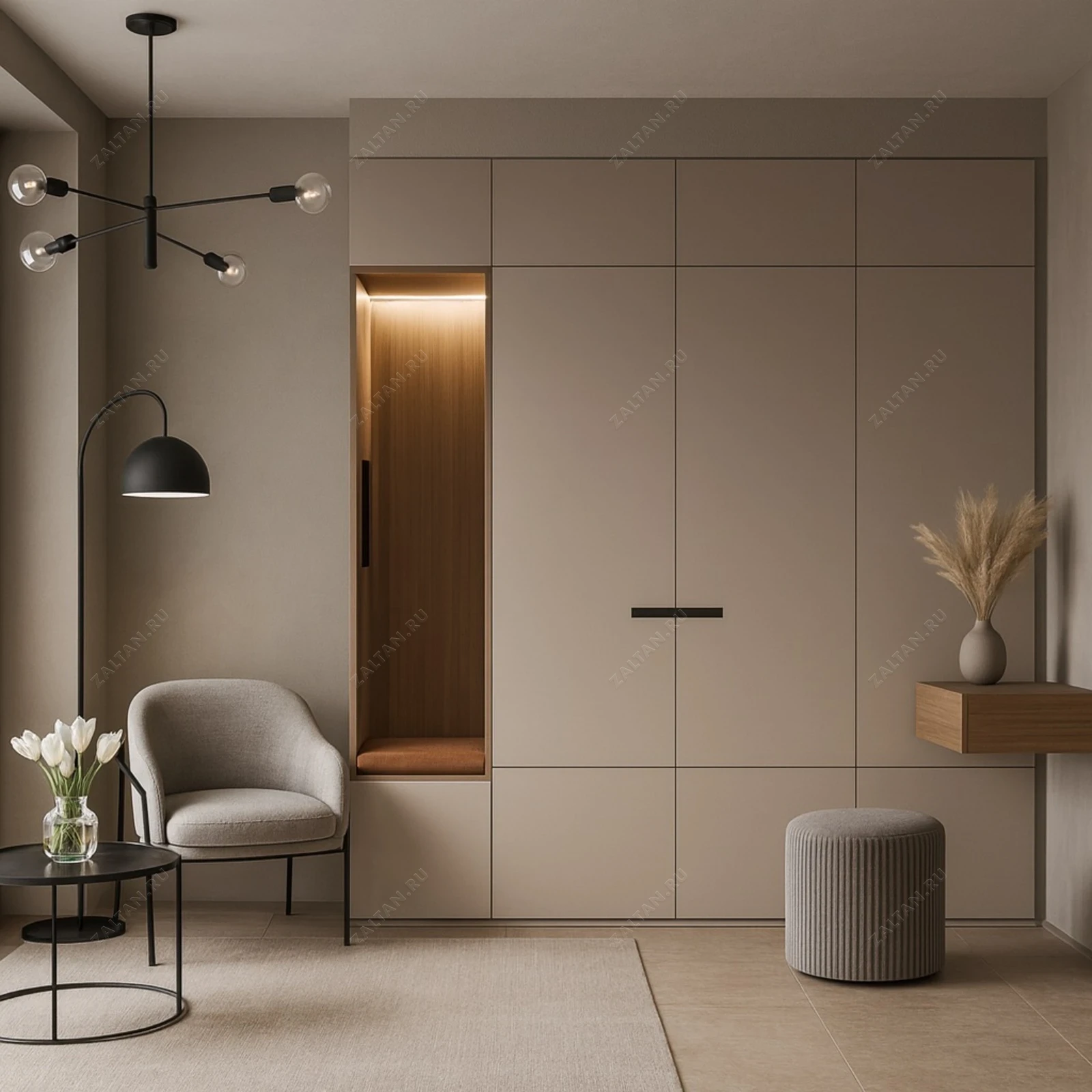Элегантный встроенный распашной шкаф для прихожей — решение премиум-класса по индивидуальным размерам. Корпус скрыт в нише, фасады выполнены в матовой МДФ-отделке бежевого оттенка, одна секция оформлена как посадочная ниша с мягкой подушкой и тёплой LED-подсветкой.