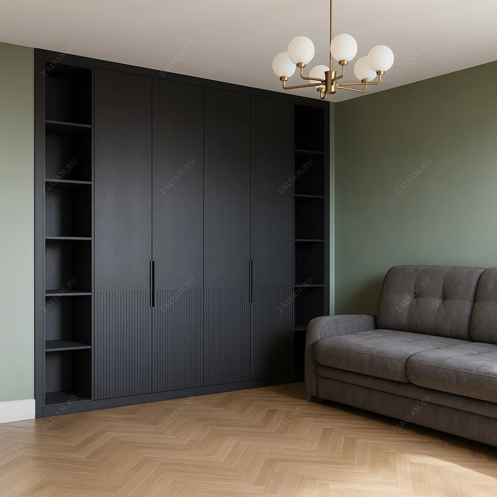 Современный встроенный распашной шкаф премиального уровня, выполнен в матовом чёрном цвете с реечным декором в нижней части. Подходит для спальни и гостиной, изготавливается под индивидуальные размеры с продуманной внутренней планировкой: штанга, полки, выдвижные ящики.