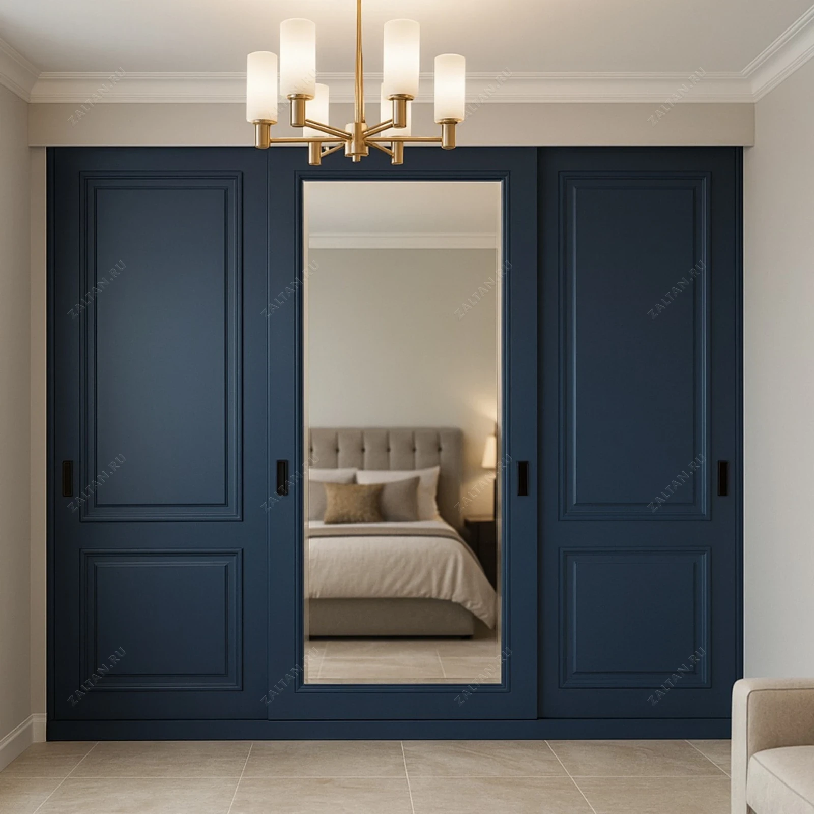 Элегантный встроенный шкаф-купе в неоклассическом стиле — премиальное решение для спальни. Фасады выполнены из МДФ с эмалевым покрытием и фрезеровкой, центральная раздвижная дверь с полноценным зеркалом.