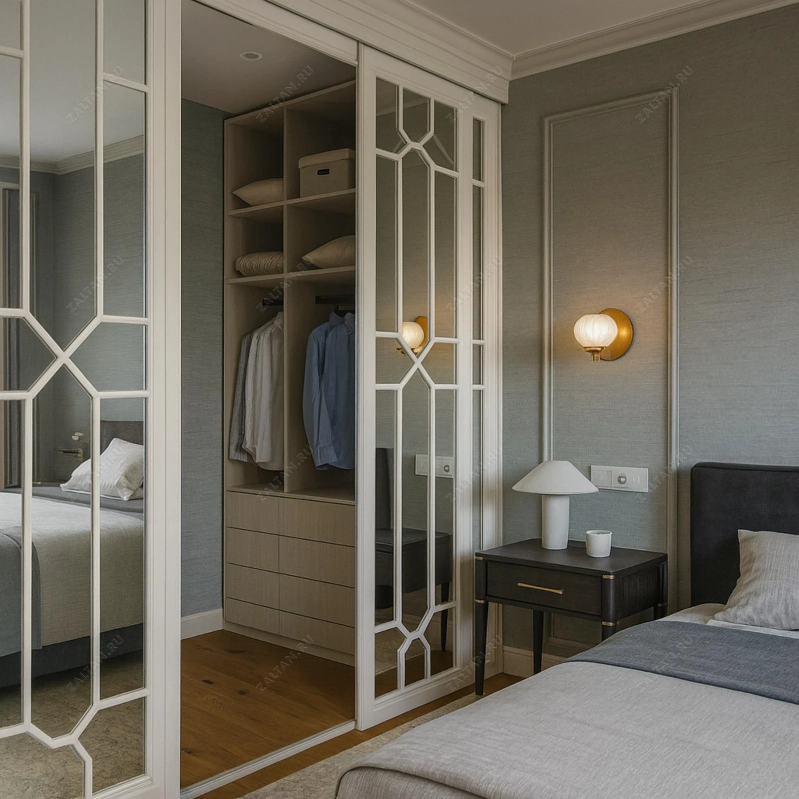 Индивидуальный встроенный шкаф-купе премиум-класса — элегантное решение для спальни. Каркас и внутренние секции выполнены из качественного ЛДСП/МДФ, фасады — зеркальные с декоративной раскладкой. Продуманная внутренняя планировка: полки, выдвижные ящики и штанги для одежды обеспечивают порядок и лёгкий доступ.