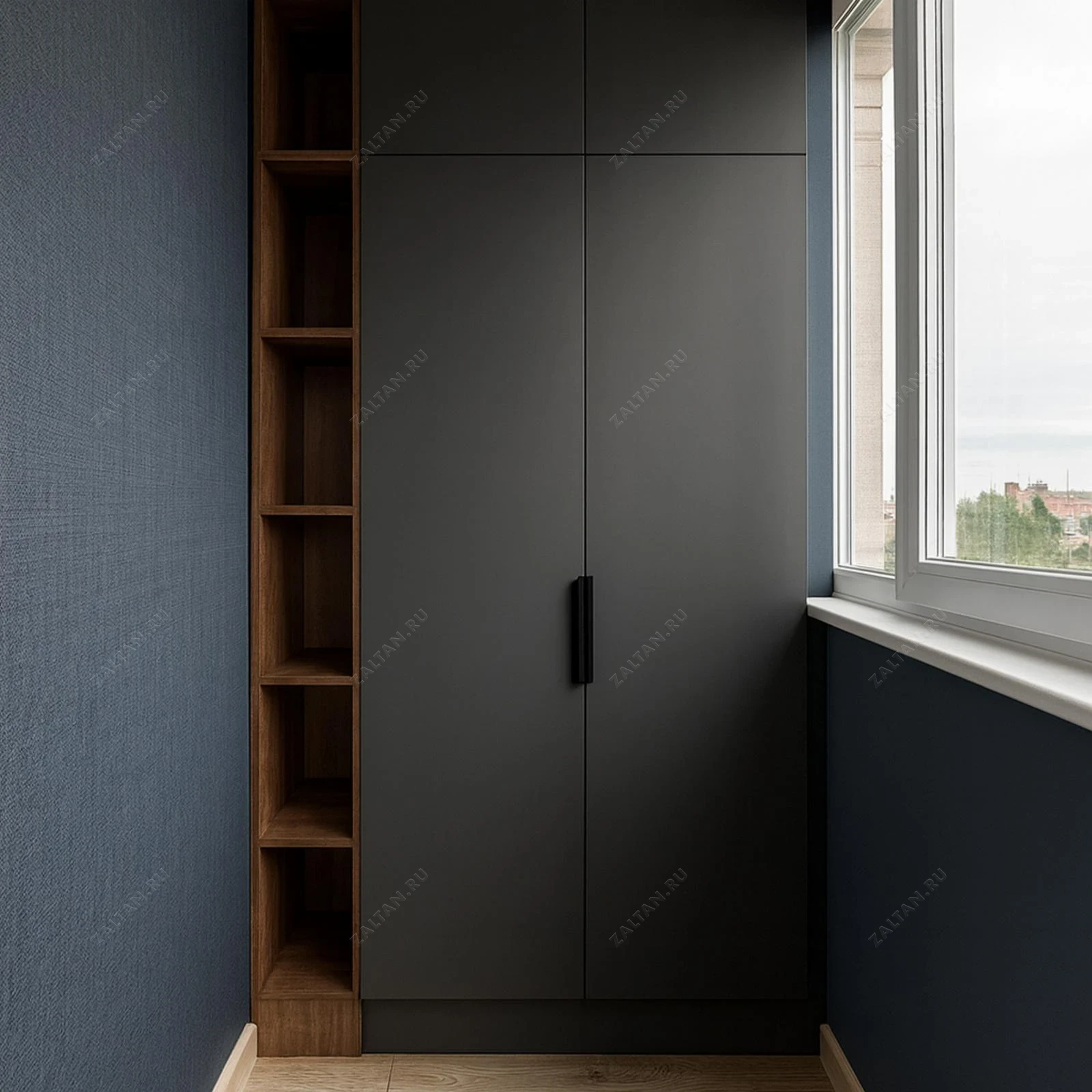 Встроенный шкаф на балкон в минималистичном исполнении: тёмно-серые матовые фасады из МДФ и боковая открытая секция со шпоном дуба. Компактная и функциональная конструкция — удобно хранить обувь, сезонные вещи и хозяйственные мелочи.