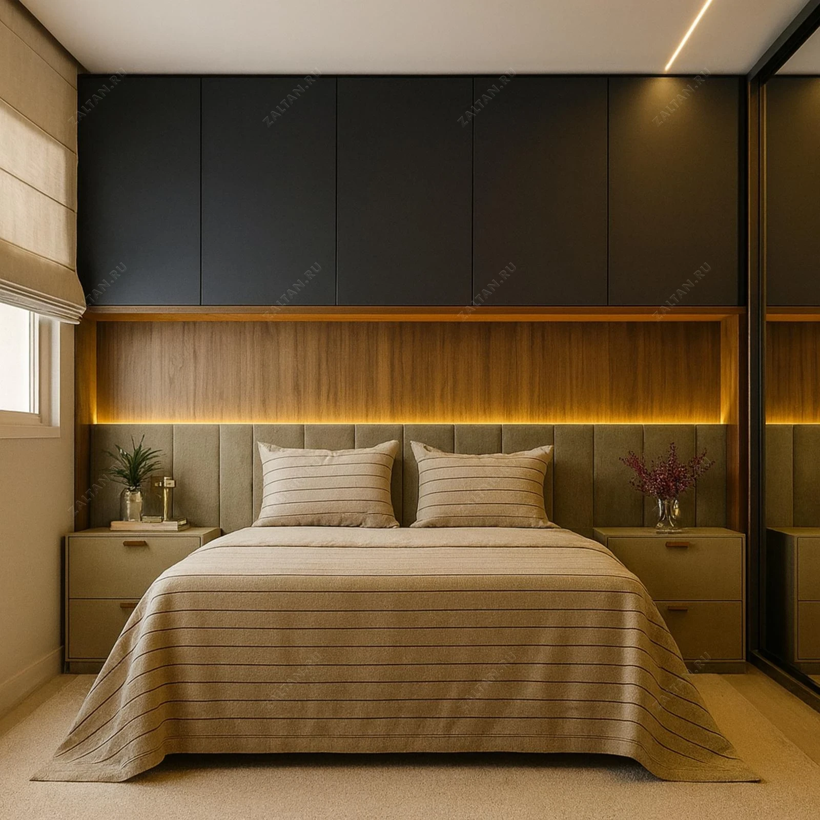 Компактная премиальная мебель на заказ — встроенный шкаф над кроватью с мягким изголовьем и парой тумб. Идеально для спальни, где важен аккуратный минимализм и рациональное использование места.