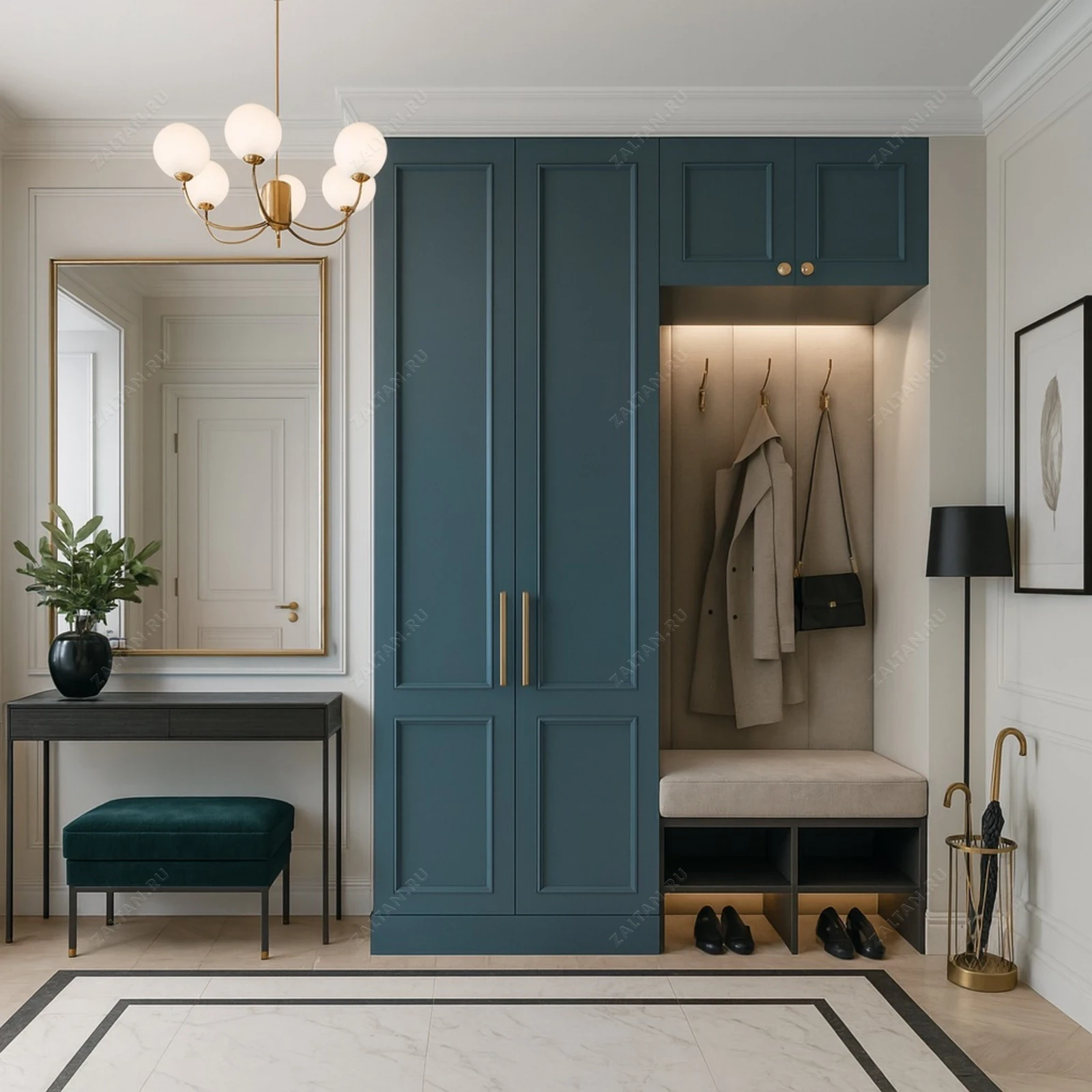 Элегантная встроенная прихожая в современно‑неоклассическом стиле: высокий шкаф с фрезерованными фасадами и встроенной нишей‑банкеткой. Продумана для хранения верхней одежды и обуви, с подсветкой в зоне крючков и открытыми секциями для быстрого доступа.