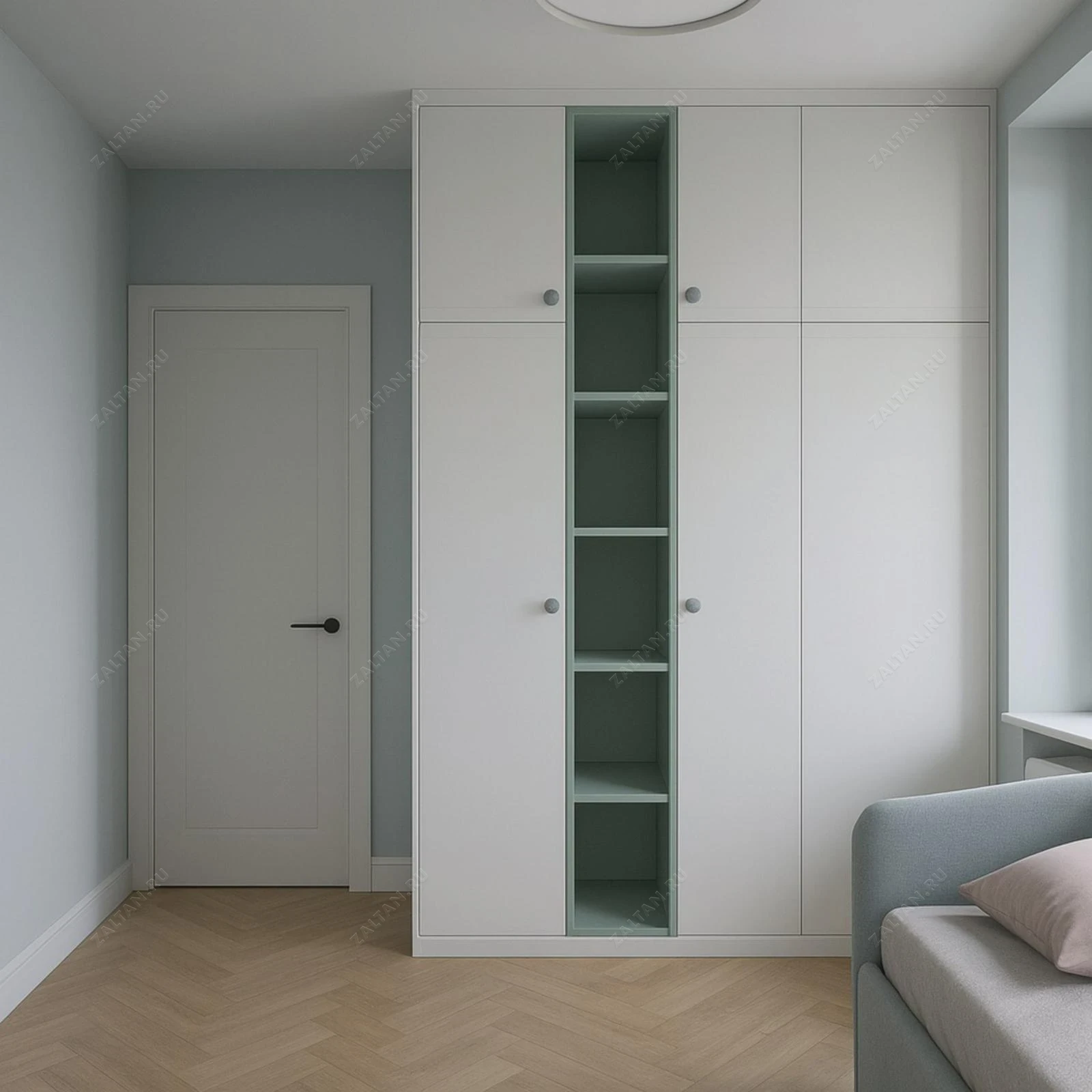 Стильный встроенный шкаф по индивидуальному размеру — решение для спальни и кабинета в скандинавском духе. Корпус и фасады выполнены в матовой белой отделке, центральная открытая ниша — в мягком зелёном цвете. Конструкция до потолка экономит пространство, верхние антресоли увеличивают объём хранения.