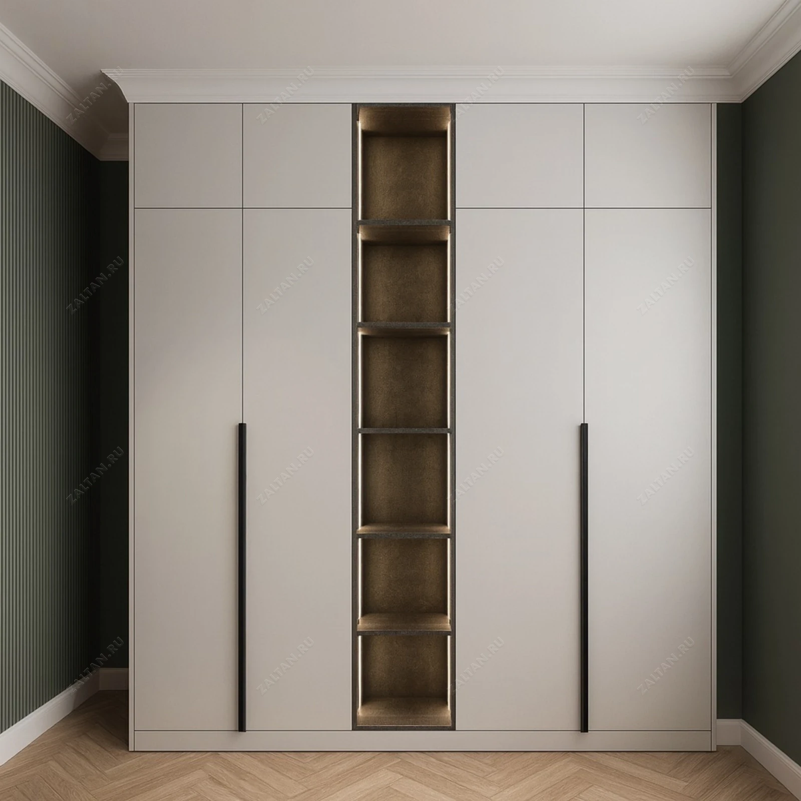 Современный встроенный распашной шкаф с вертикальной открытой нишей. Матовая окраска фасадов и тонкие чёрные вертикальные ручки подчёркивают минималистичный стиль, ниша с тёплой металлической отделкой и подсветкой создаёт выразительный акцент.