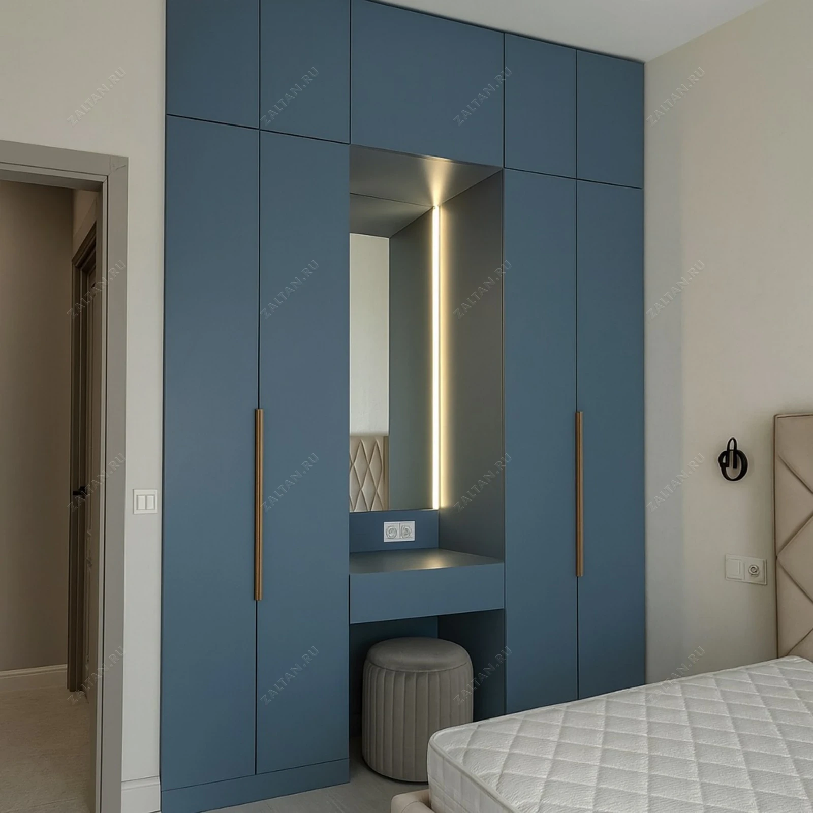 Встроенный шкаф с нишей и зеркалом — премиальная мебель под заказ. Корпус и фасады из матового МДФ синего оттенка, верхняя антресоль до потолка, ниша-туалетный столик с выдвижным ящиком и вертикальной LED-подсветкой.