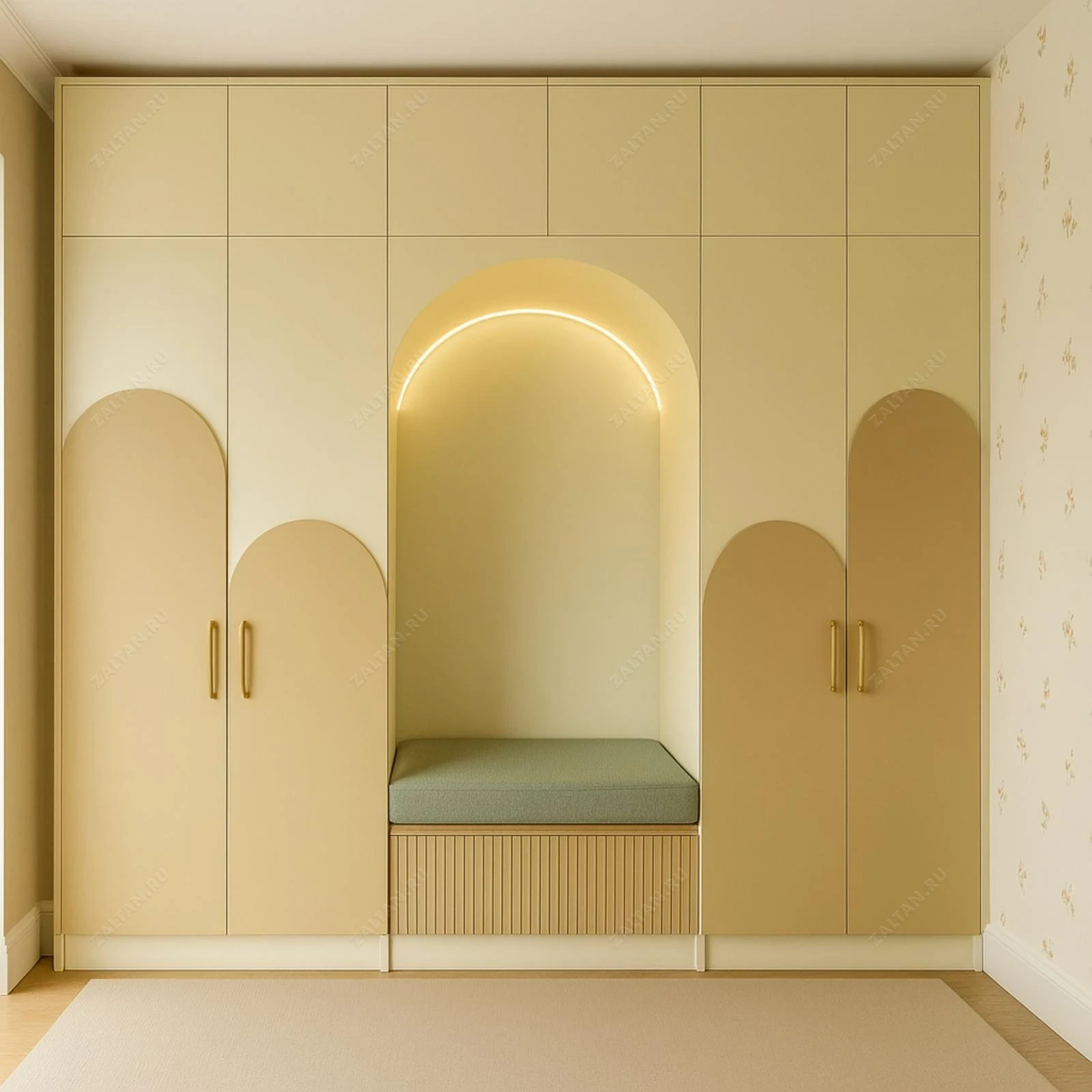 Премиальный встроенный шкаф с сиденьем-нишой и декоративной аркой. Выполнен в тёплой бежево‑кремовой гамме, сочетает фрезерованный фланг на ящике и гладкие матовые фасады.
