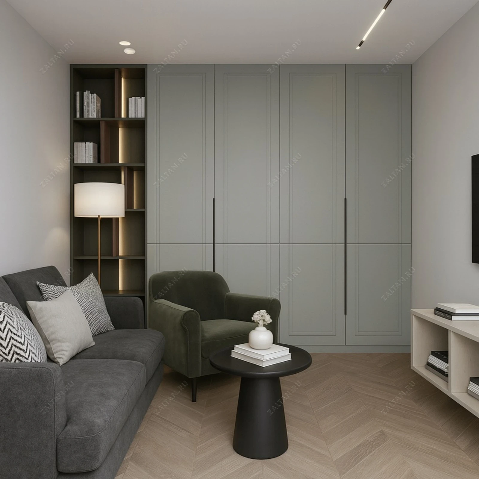 Элегантный встроенный шкаф под гостиную с открытой боковой секцией для книг и декора. Изготовлен на заказ, с аккуратной фрезеровкой фасадов и матовой окраской в приглушённый зелёный оттенок. Продуманная внутренняя планировка позволяет сочетать хранение одежды и демонстрацию аксессуаров.