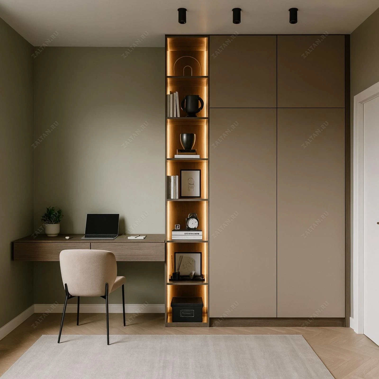 Встроенный шкаф-гардероб с вертикальным открытым пеналом и интегрированной рабочей зоной. Минималистичный матовый фасад без ручек и тёплая светодиодная подсветка в нишах подчёркивают премиальную сборку.
