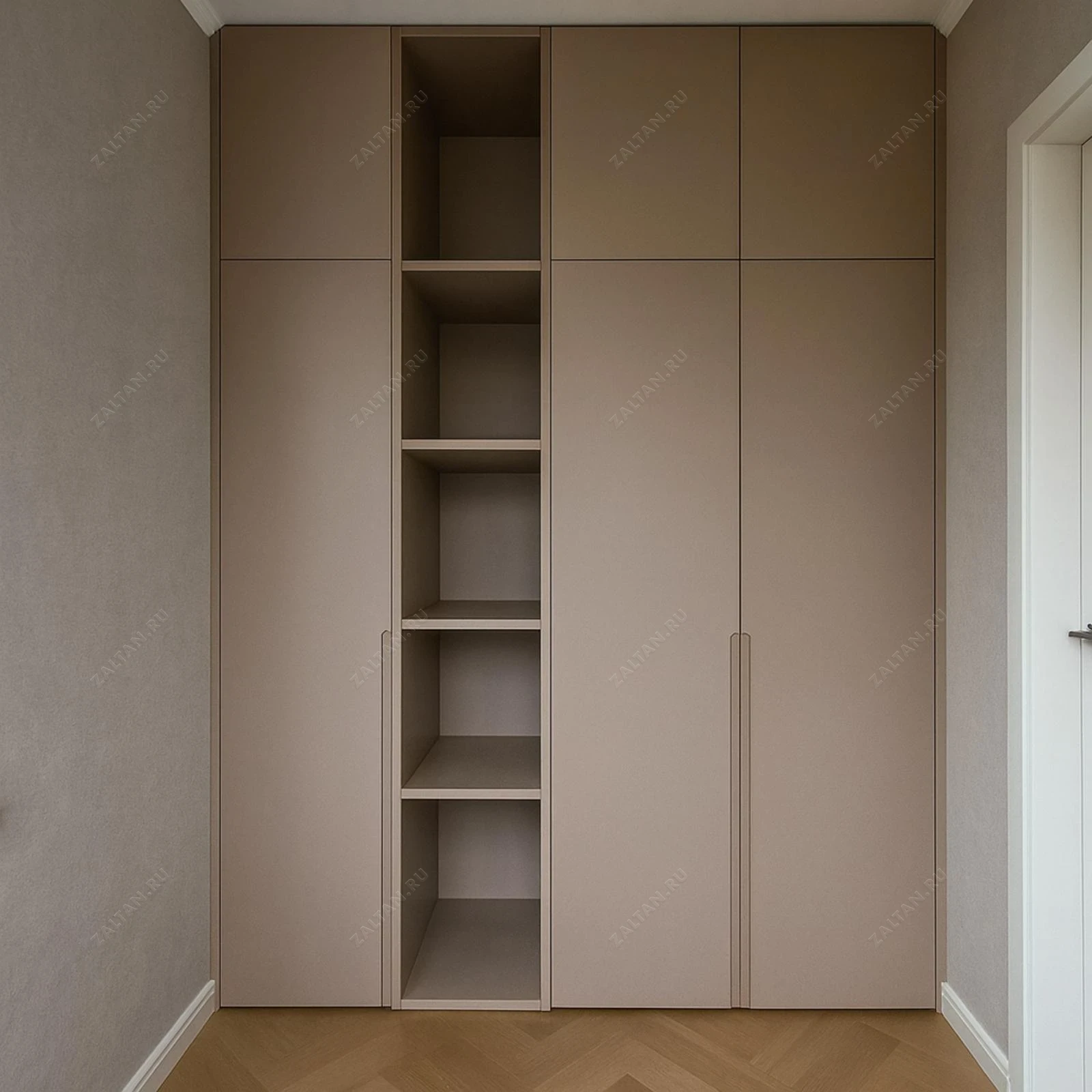 Встроенный шкаф премиум-класса в мягком бежево-коричневом оттенке. Матовые МДФ-фасады без декора и интегрированные вертикальные ручки создают лаконичный, спокойный фасад. Центральная открытая ниша с полками функциональна для обуви, сумок или декоративных вещей.