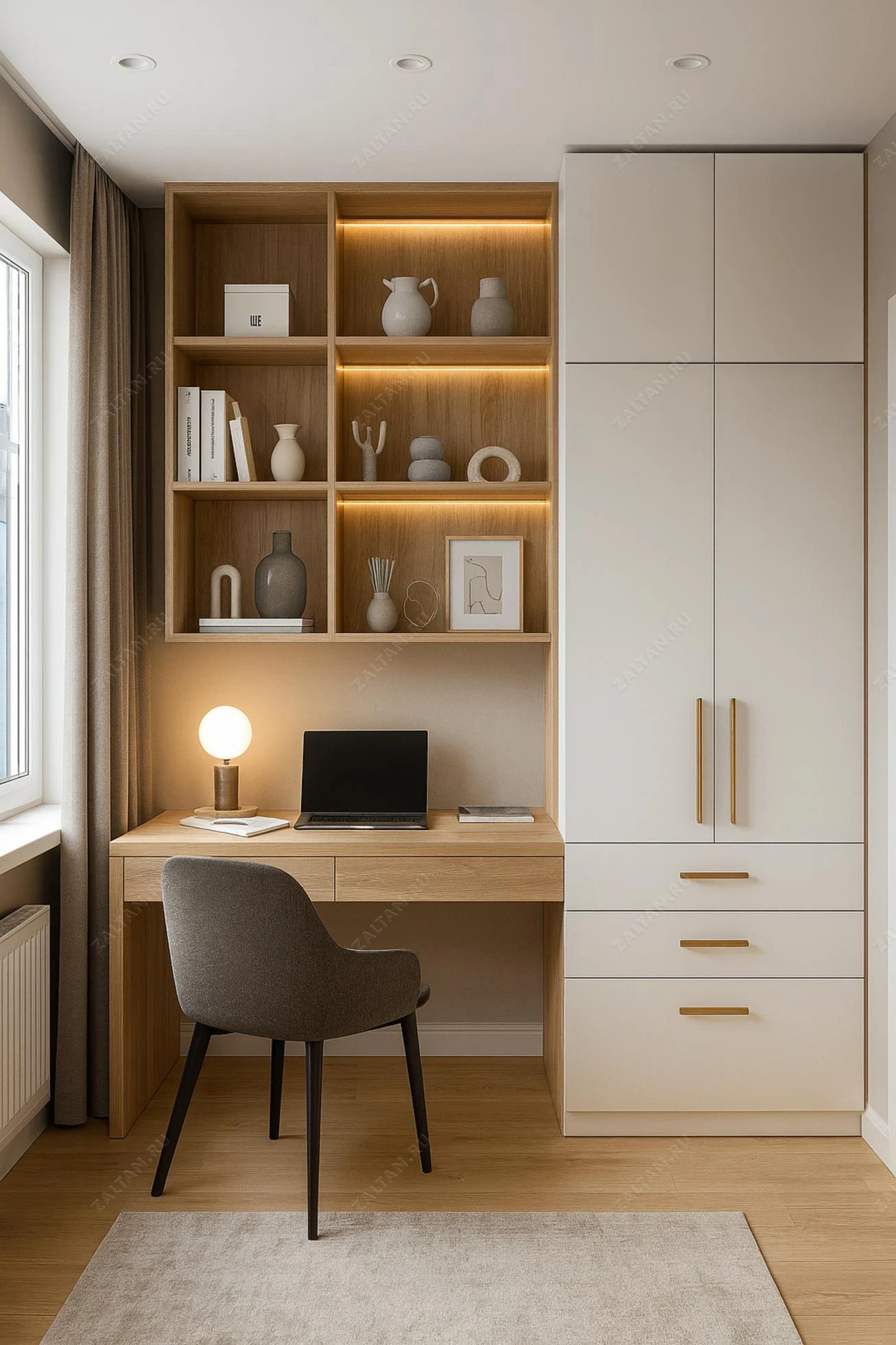 Элегантный встроенный шкаф с рабочей зоной — практичное решение для спальни или кабинета. Комбинация тёплого дуба в открытых нишах и кремовых распашных фасадов подчёркивает премиум-стиль.