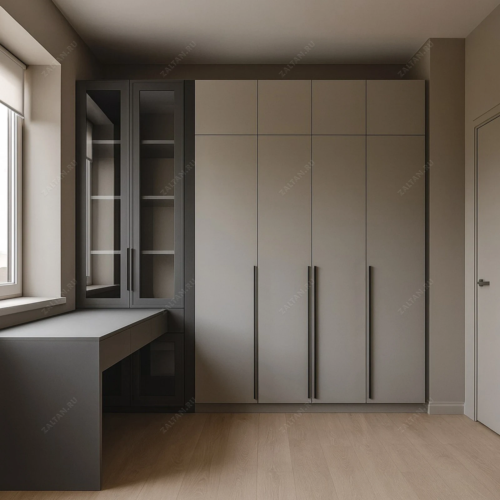 Элегантный встроенный шкаф со встроенной рабочей зоной — решение премиум-класса для спальни или кабинета. Выполняется по индивидуальным размерам, обеспечивает аккуратный, бесшовный вид до потолка.