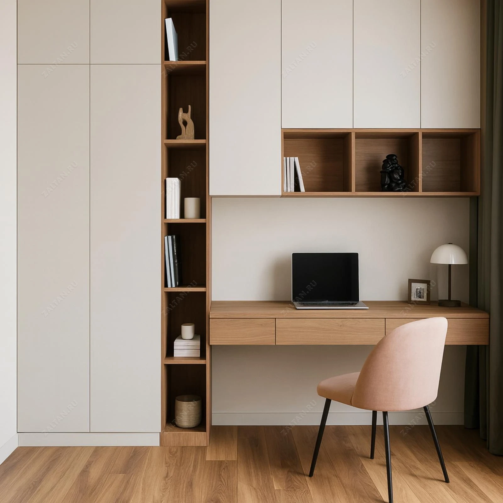 - Функция: встроенный шкаф + рабочий стол с ящиками и открытыми нишами.