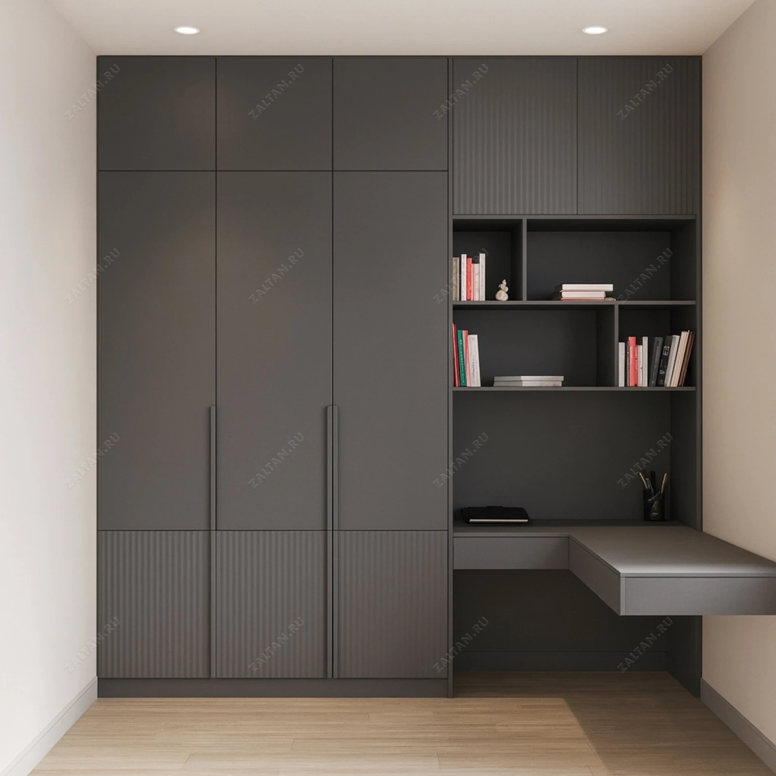 Встроенный шкаф с интегрированной рабочей зоной в тёмно‑серой матовой отделке. Комбинация распашных фасадов и открытых ниш даёт пространство для одежды и книг, а подвесной стол с выдвижным ящиком превращает нишу в удобное рабочее место.