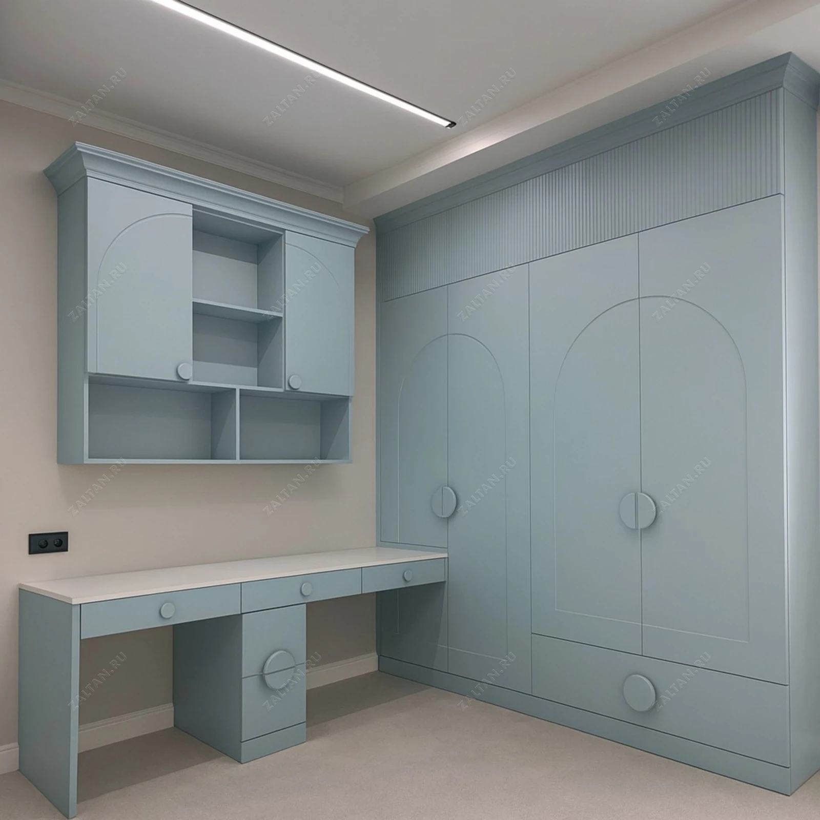Премиальный встроенный гарнитур в пастельно-голубом цвете: сочетание вместительного шкафа и рабочей поверхности. Изготовлен по индивидуальным размерам с использованием МДФ с эмалевым покрытием и матовой фактурой.