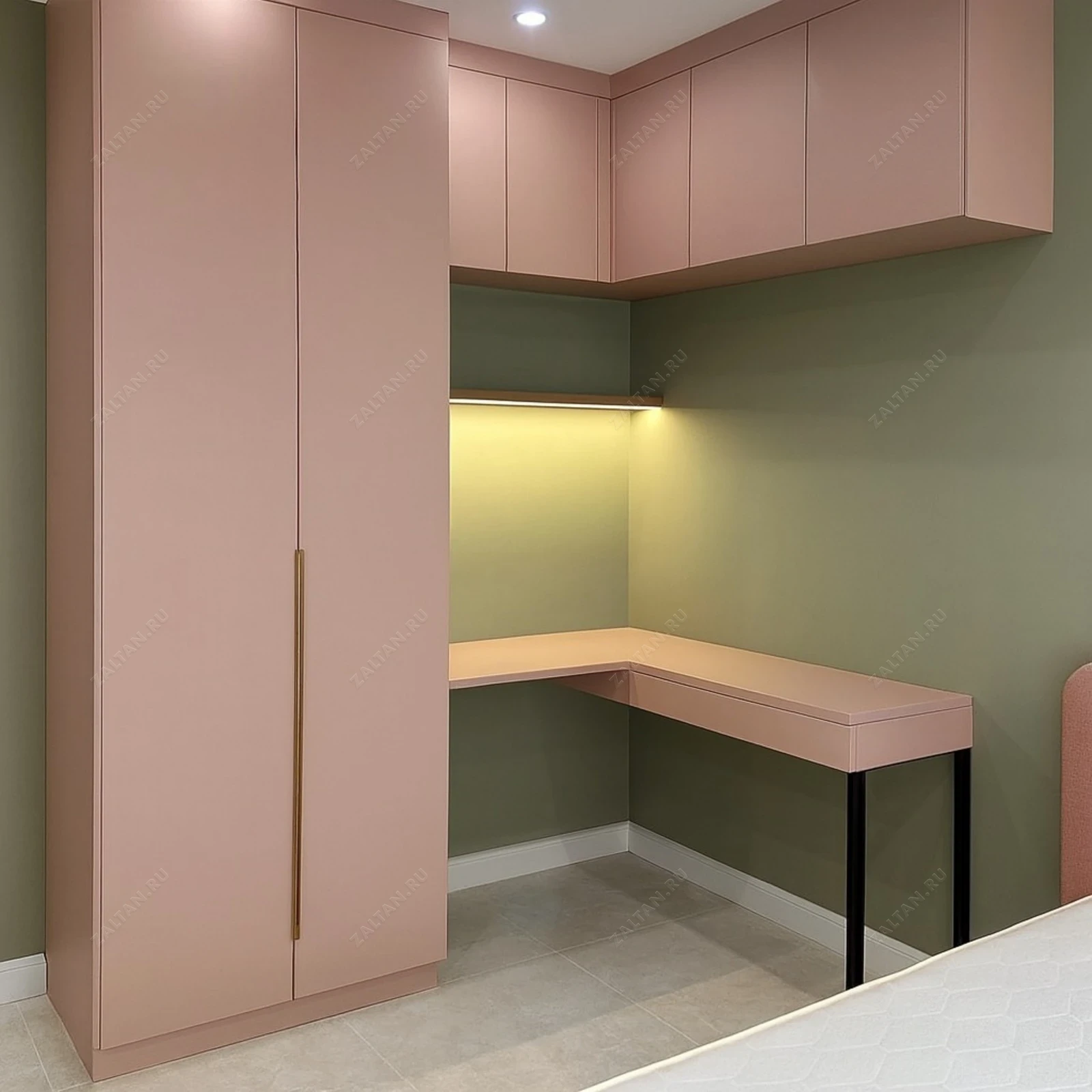 Компактная гардеробная система под индивидуальный размер: высокий шкаф с двумя распашными дверями, навесные шкафчики и интегрированная рабочая поверхность в углу. Матовый лакированный фасад в пастельном розовом оттенке и тонкая латунная ручка придают изделию премиальный вид.
