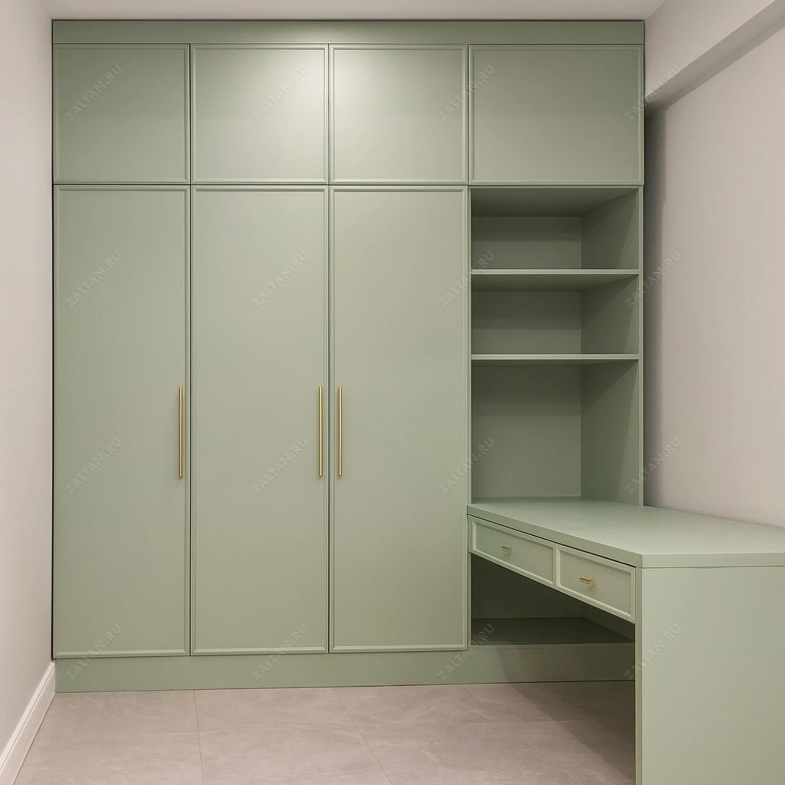 Элегантный встроенный шкаф с интегрированной рабочей зоной — идеальное решение для компактного кабинета или спальни. Фасады с рамочной фрезеровкой, матовая эмаль в мягком зелёном оттенке и латунные ручки подчеркивают премиальный характер изделия.