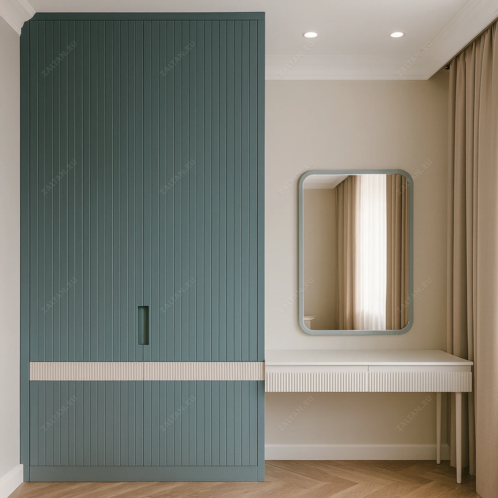 Элегантный встроенный шкаф с реечной фактурой и интегрированной нишей для туалетного столика. Выполнен на заказ, подходит для современных интерьеров: сканди и минимализм. Фасад — реечная МДФ/шпон, скрытые ручки, глубокая система хранения для одежды и белья.