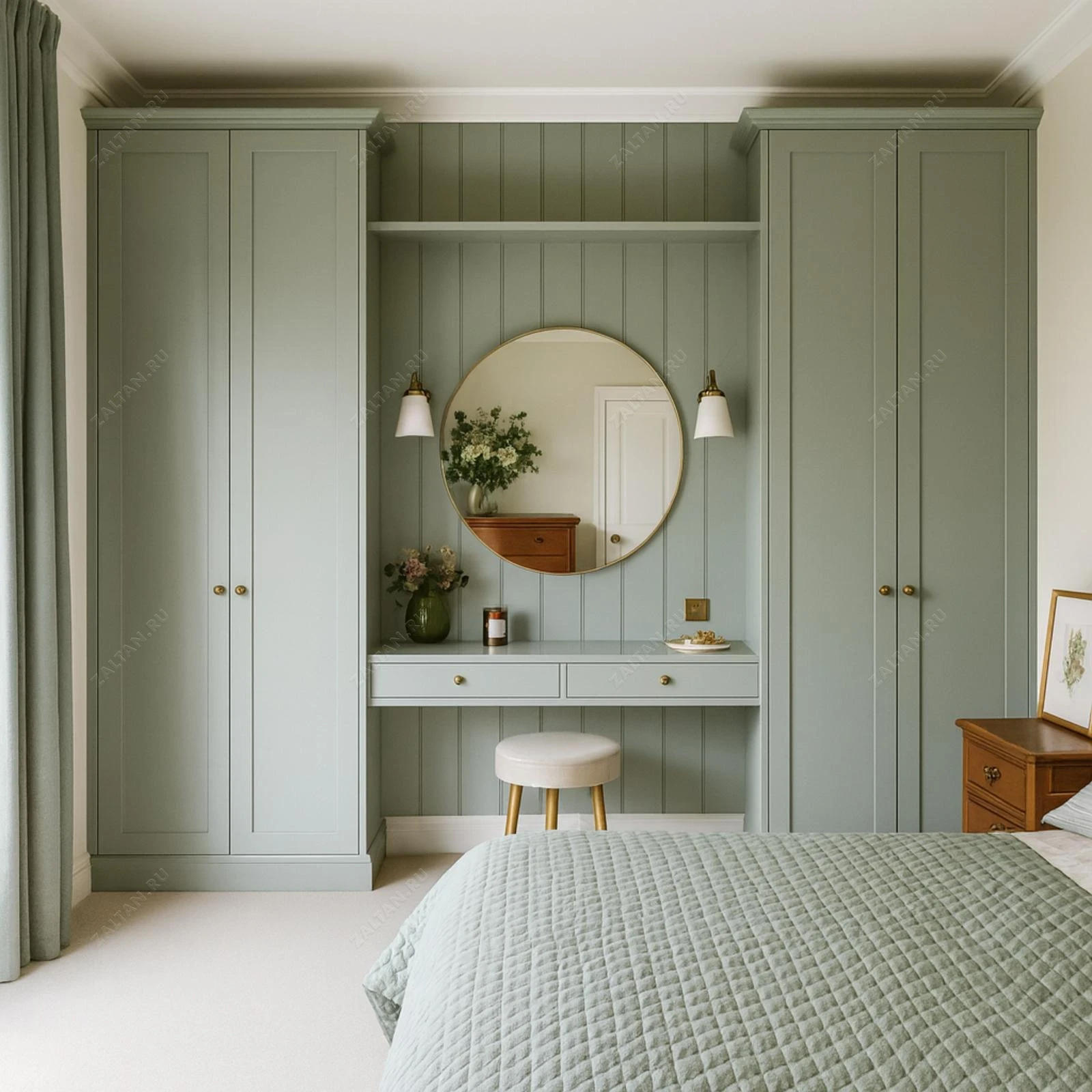 Комплексная встроенная система: два высоких шкафа по бокам и центральная зона с туалетным столиком, круглым зеркалом и открытой полкой. Матовая окраска в нежно-зелёном тоне, фрезерованные филёнки и классический карниз подчёркивают премиальный характер изделия.