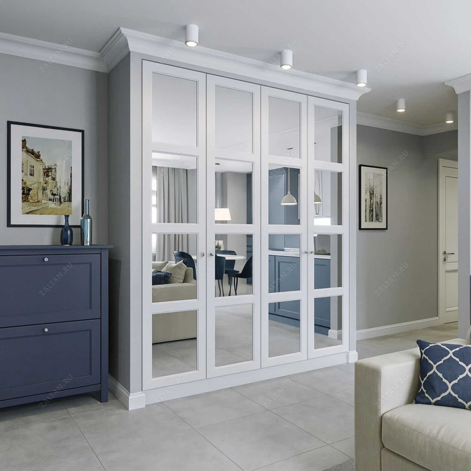 Встроенный шкаф в неоклассическом стиле с зеркальными филёнками и декоративной коронкой. Выполнен на заказ под потолок, гармонично вписывается в прихожую или гостиную.