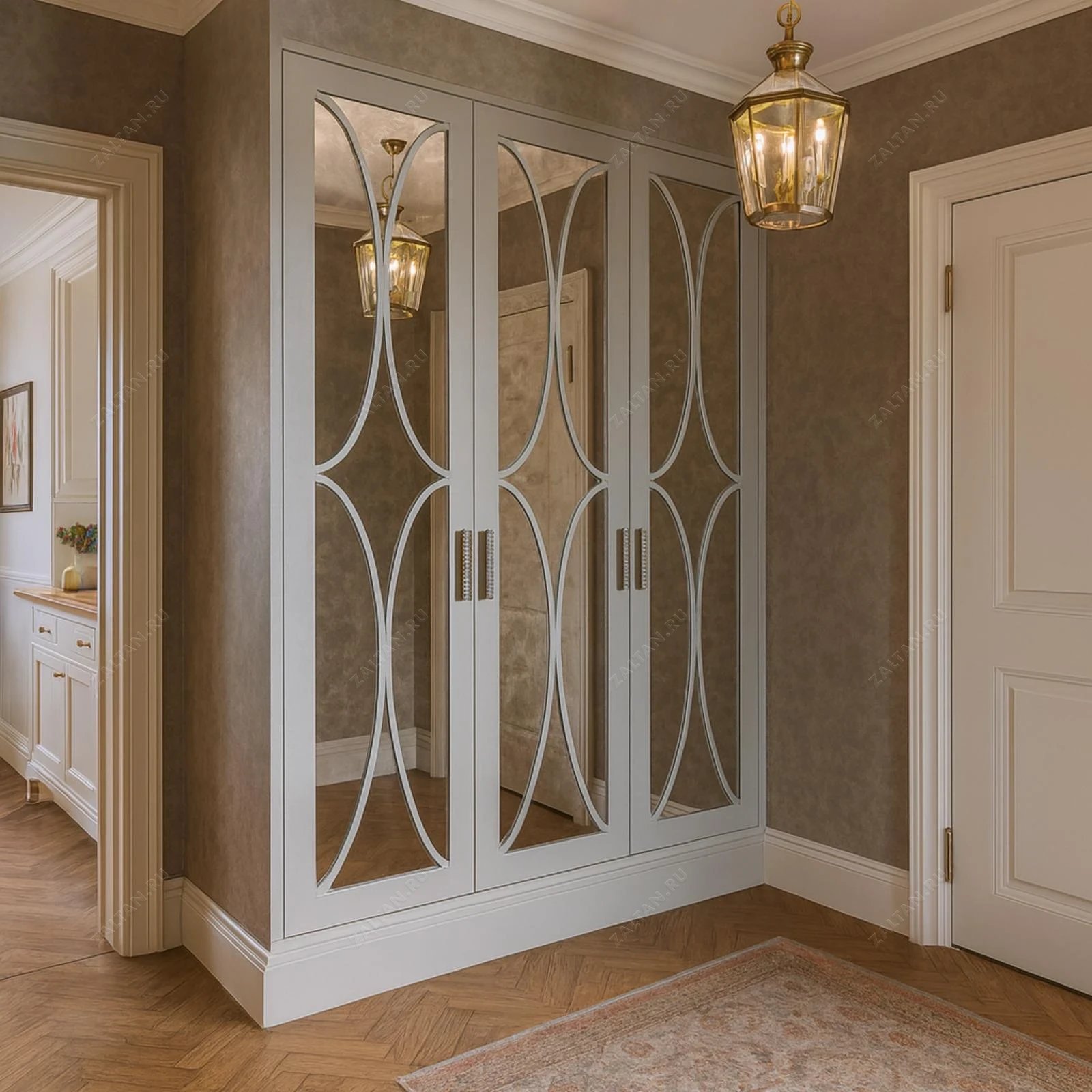 Элегантный встроенный шкаф с зеркальными распашными дверями в неоклассическом стиле. Выполнен по индивидуальным размерам с фрезерованными декоративными накладками и аккуратной фурнитурой — идеальное сочетание эстетики и практичности.