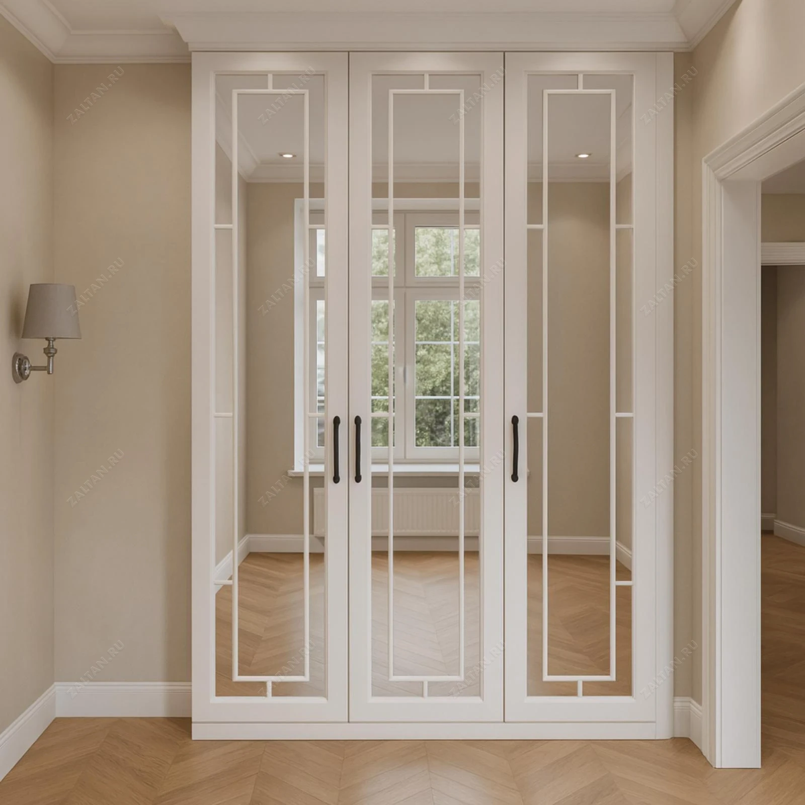 Элегантный встроенный шкаф с зеркальными распашными дверями в неоклассическом стиле. Выполнен в белом цвете из МДФ с декоративной раскладкой на зеркалах и контрастными ручками.