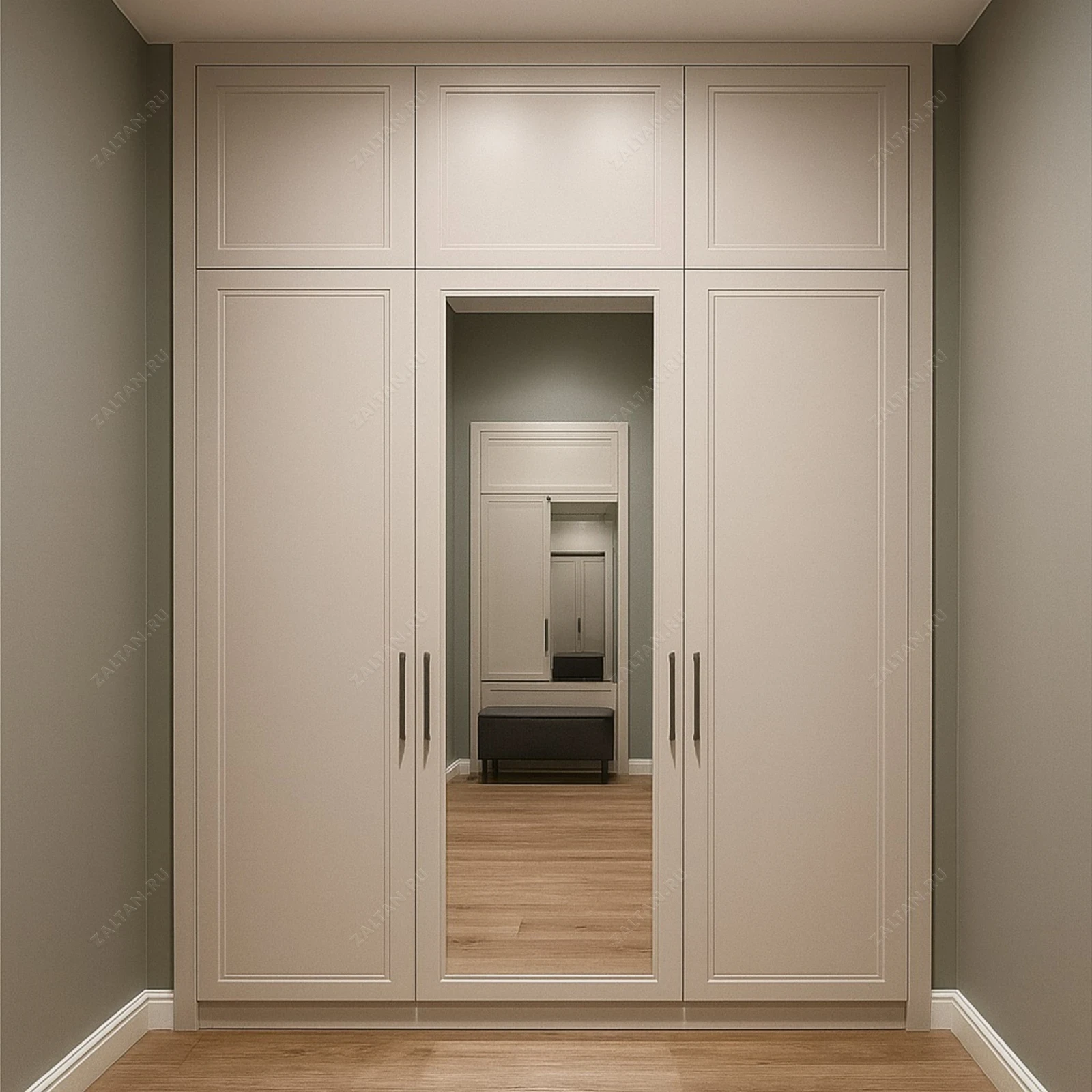 Премиальный встроенный распашной шкаф по индивидуальным размерам. Классические филёнчатые фасады из МДФ с эмалевым покрытием, встроенное зеркало в центральной створке и антресоль для хранения — решение для аккуратной и спокойной спальни или прихожей.