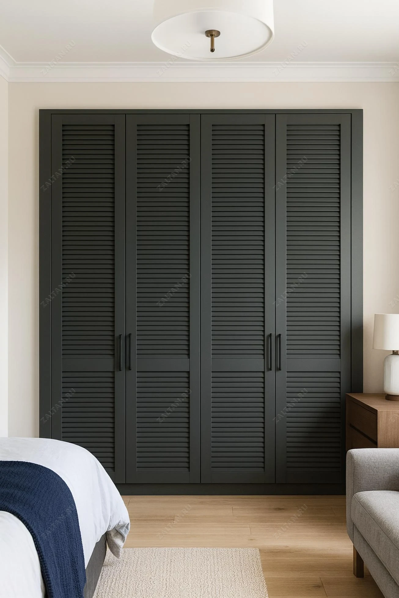 Элегантный встроенный шкаф с жалюзийными дверями, выполненный в тёмном матовом оттенке. Идеальное решение для спальни и зон хранения в премиальном интерьере.