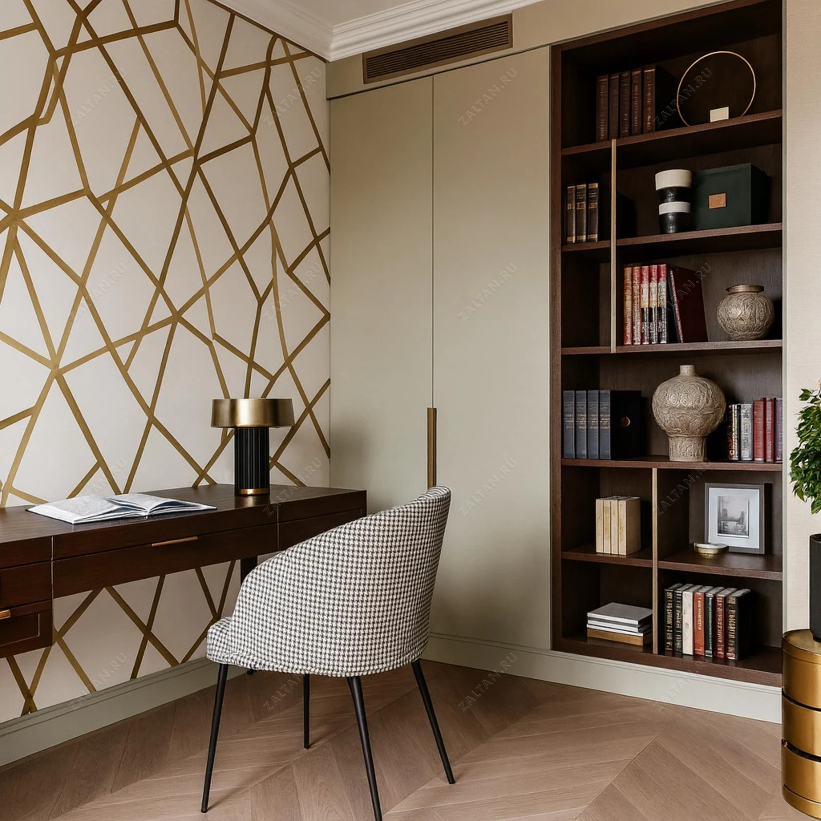 - Матовые МДФ фасады и шпоновые полки, тонкая латунная ручка;