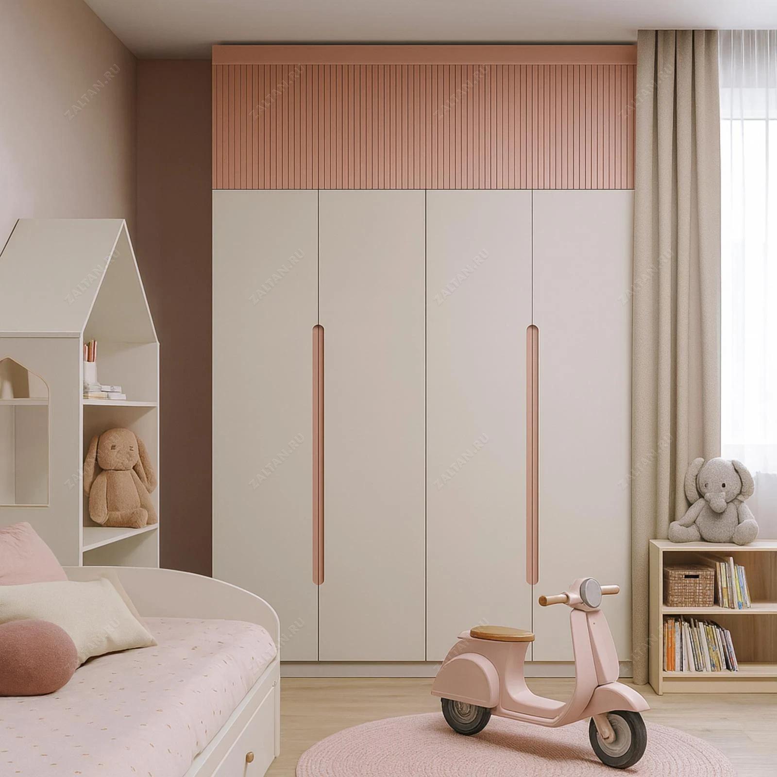 Элегантный встроенный шкаф для детской — гармоничное сочетание кремовых фасадов и мягких розовых акцентов. Выполняется по индивидуальным размерам, оптимизирован для хранения одежды и аксессуаров.