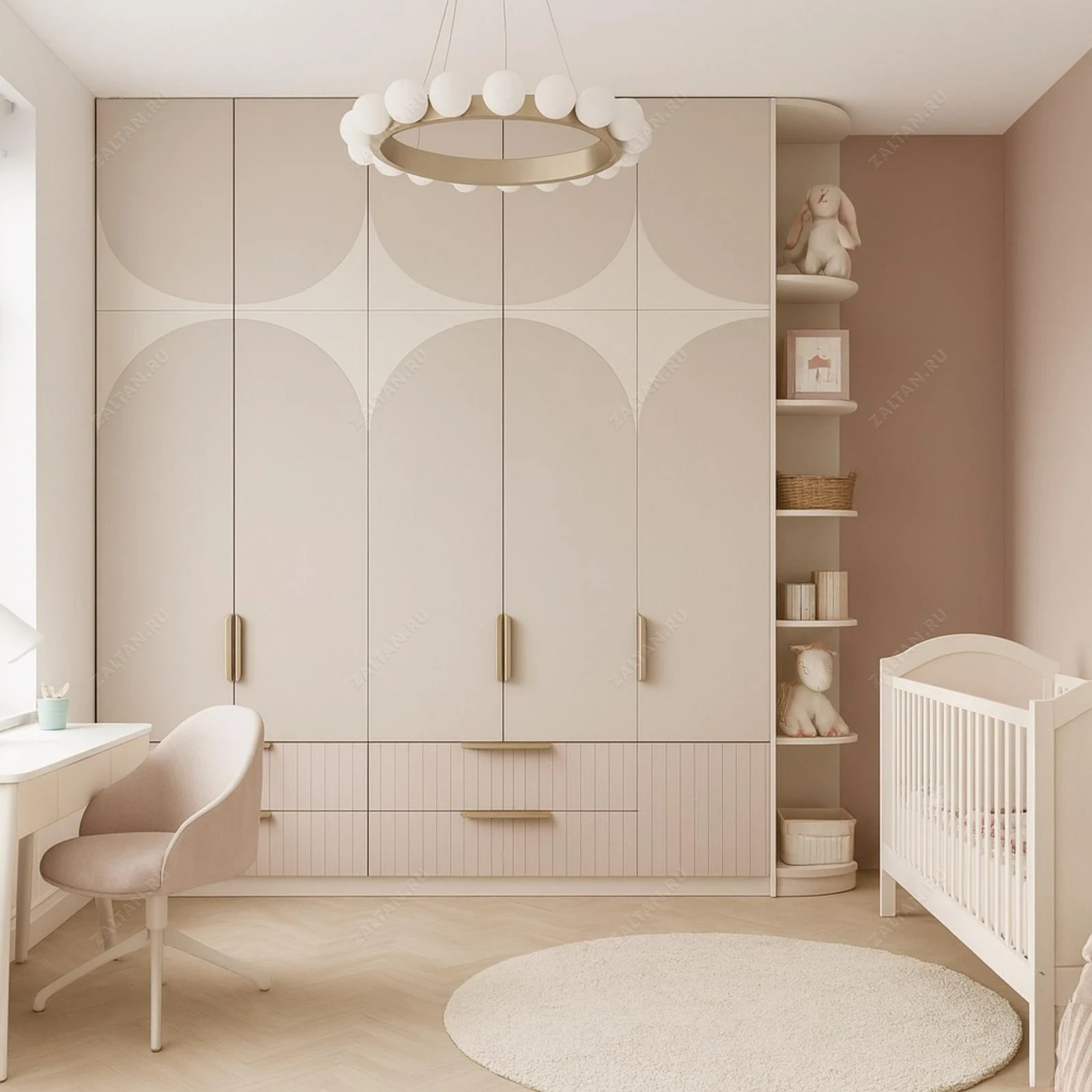 Дизайнерский анализ: визуально это встроенный шкаф до потолка с арочными графическими фасадами и декоративной реечной панелью внизу. Справа — открытые закруглённые полки для игрушек. Использованы матовые пастельные тона и латунные ручки.