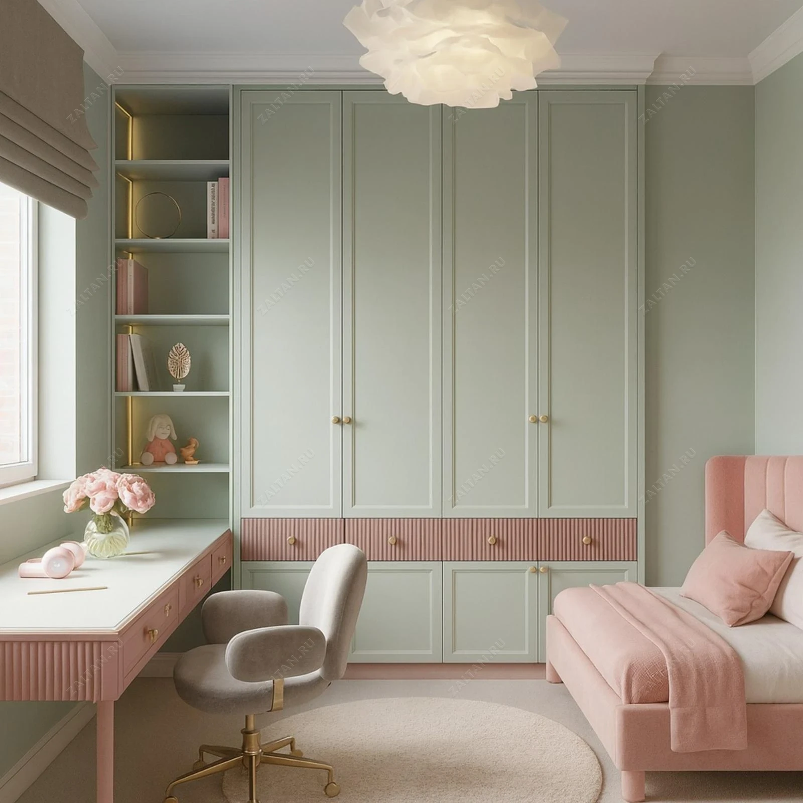 Элегантный встроенный шкаф под заказ — решение для детской или подростковой комнаты. Короб и фасады из МДФ с фрезеровкой и реечной вставкой, матовая окраска в нежно‑зеленом и розовом акценте. Внутри — регулируемые полки, выдвижные ящики и отделение для штанги.