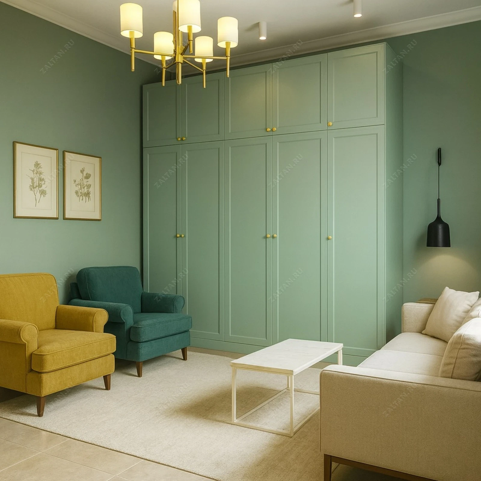 Встроенный распашной шкаф премиального уровня, выполнен под потолок из окрашенного МДФ с фрезерованными филёнками и декоративными латунными ручками. Решение для гостиной с верхними антресолями и просторными отделениями для одежды.