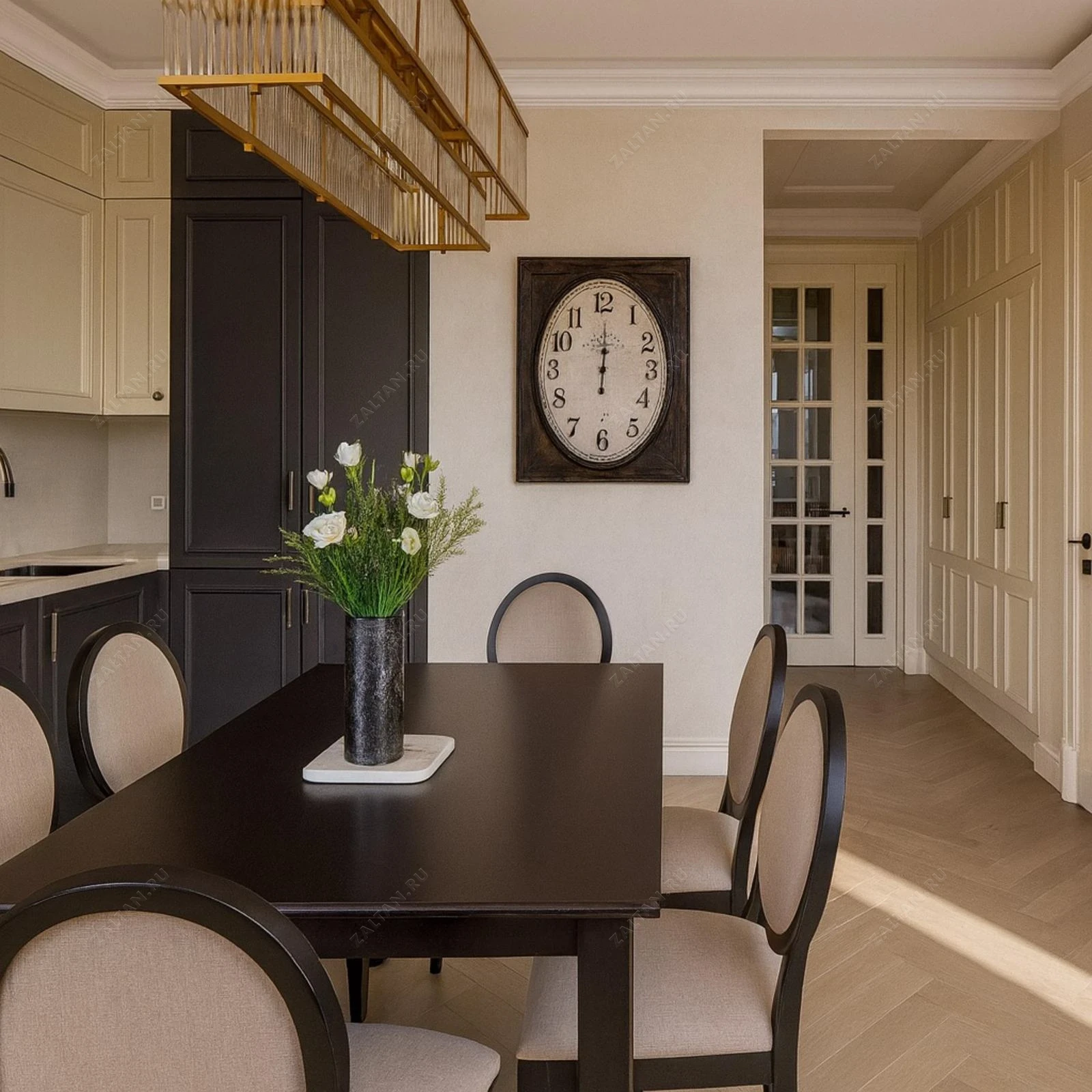 Встроенный шкаф для кухонной зоны — премиальное изделие на заказ. Выполнен в неоклассическом стиле с филёнчатыми фасадами и продуманной внутренней компоновкой: полки, выдвижные ящики и антресоль.