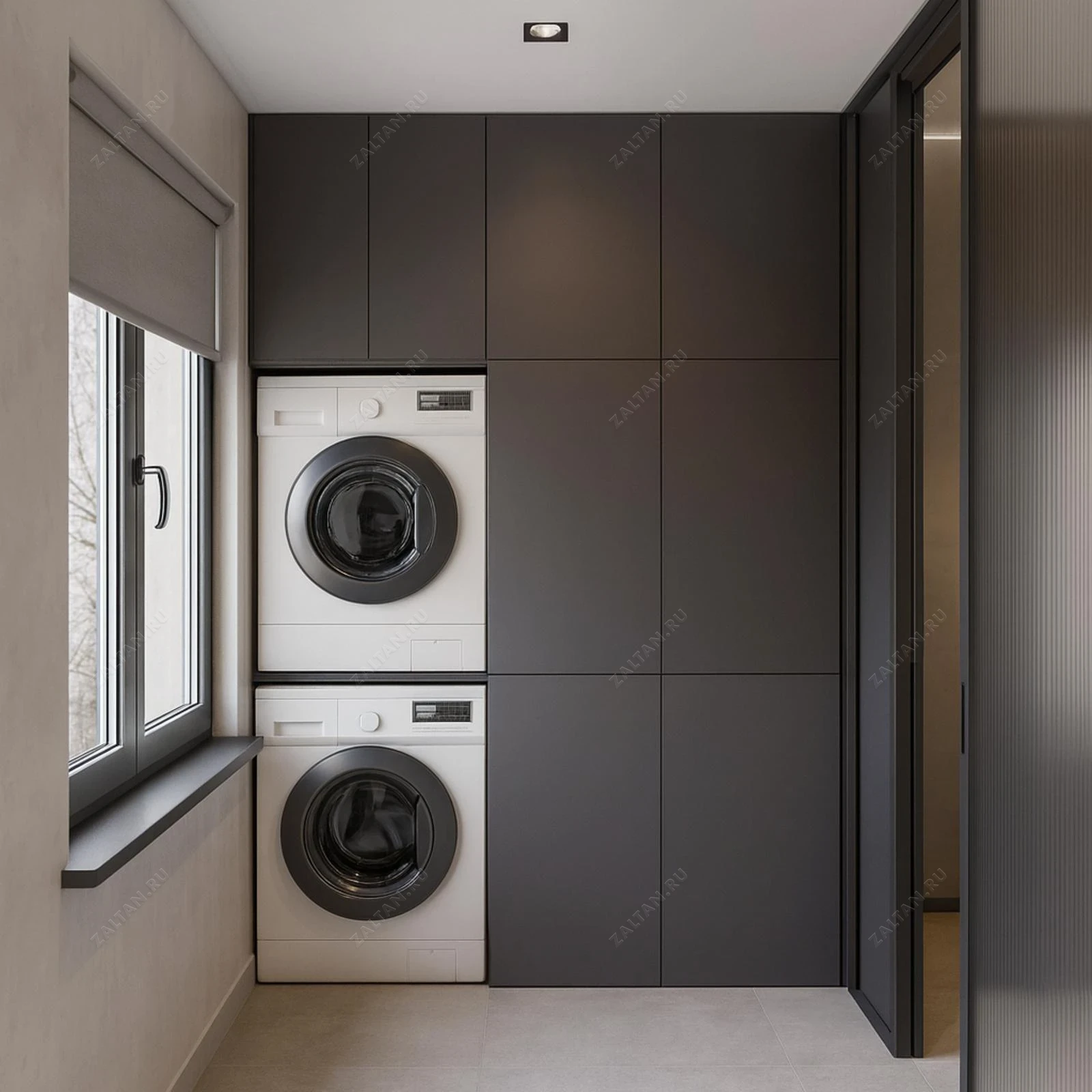 Элегантный встроенный шкаф для постирочной, спроектированный под вертикальную установку стиральной и сушильной машин. Премиальное исполнение в матовом тёмном оттенке, аккуратные фасады без ручек и продуманная система хранения — оптимальное решение для компактных зон.