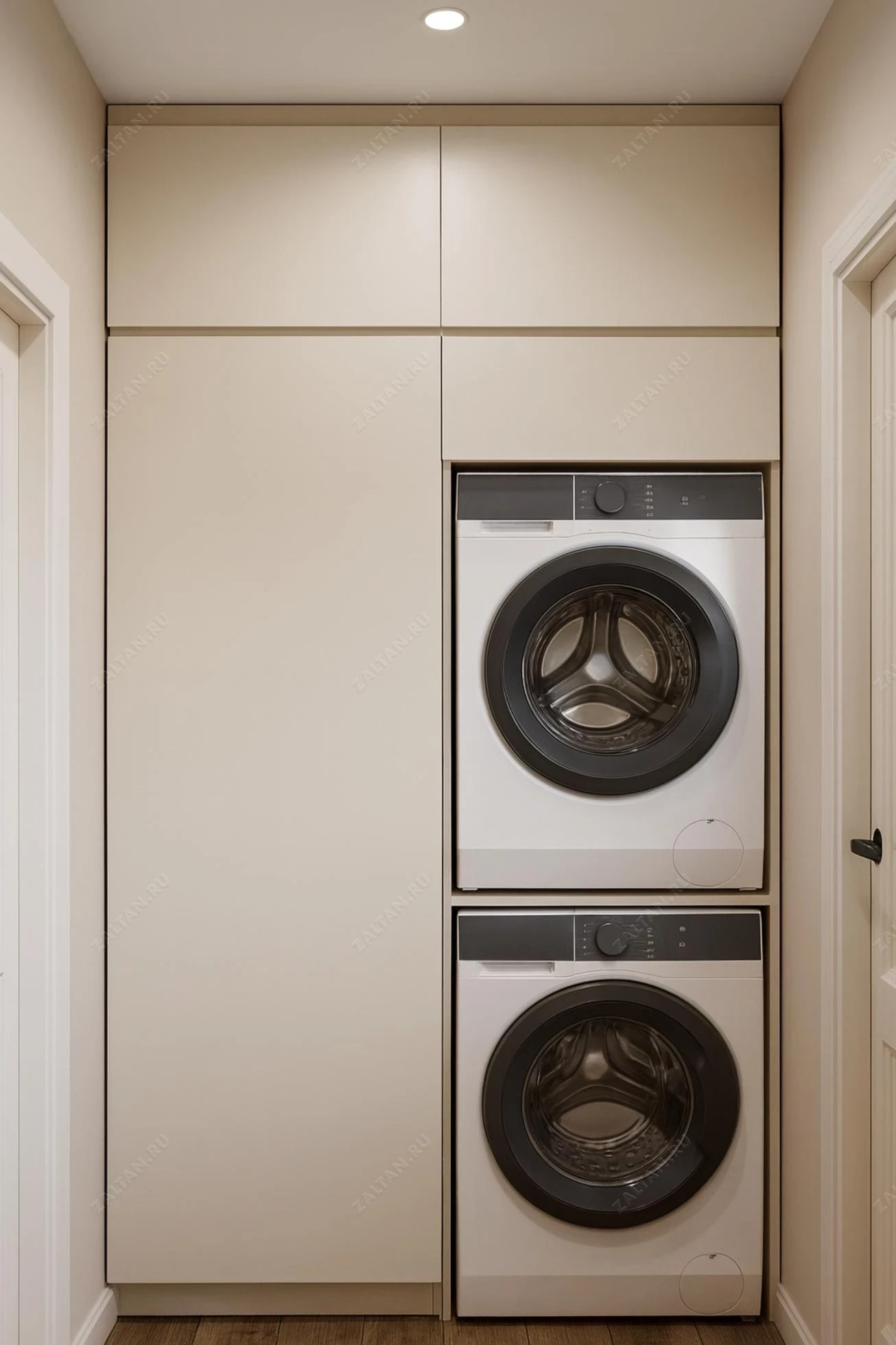 Элегантный встроенный шкаф‑пенал под стиральную и сушильную машины, выполненный в спокойном бежевом оттенке. Идеальное решение для постирочной или прихожей при ограниченном пространстве.