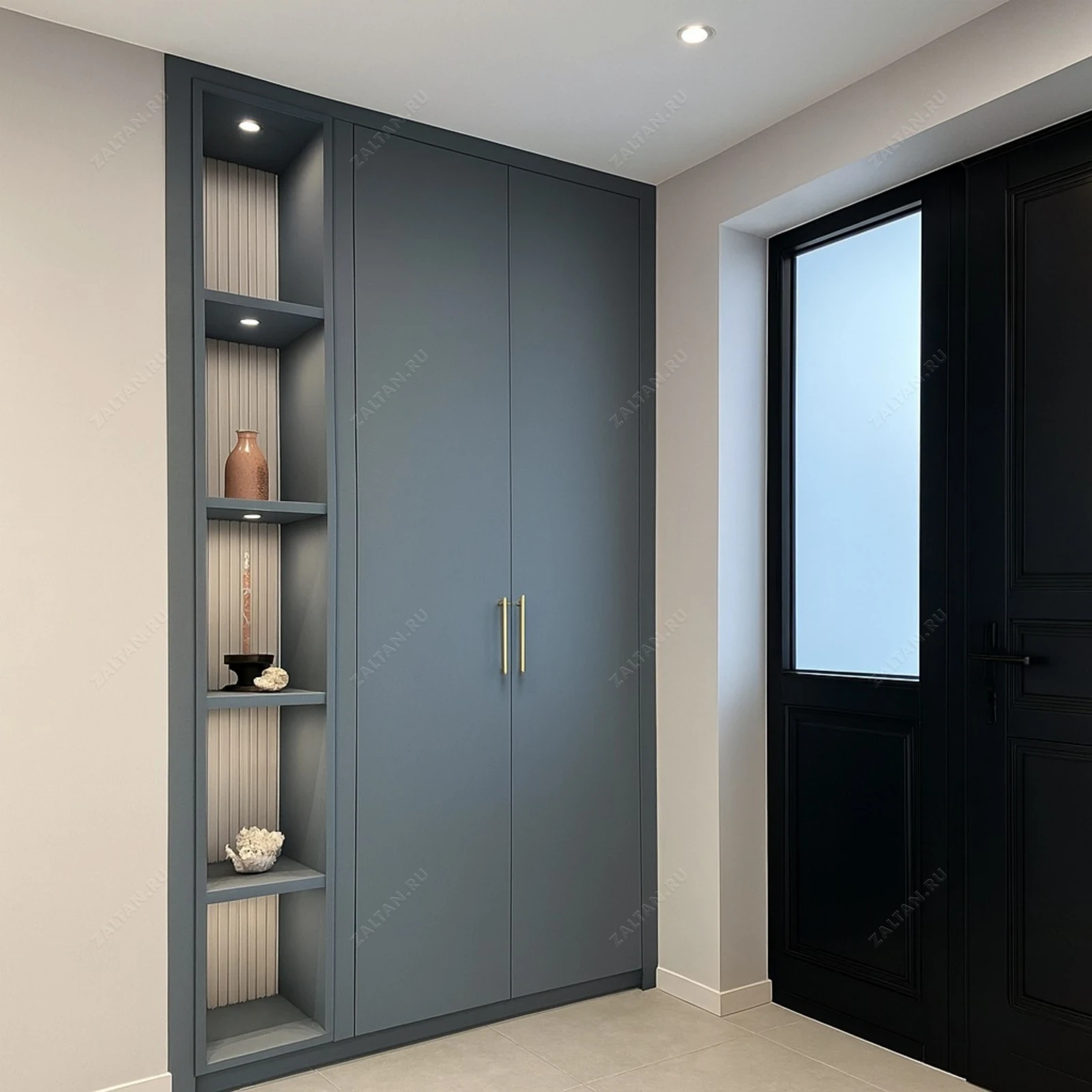 Элегантный встроенный шкаф для прихожей в матовом серо‑синем оттенке. Компактная модель сочетает закрытую секцию для верхней одежды и скрытого хранения с открытой колонной ниш для декора и ключевых мелочей. Встроенная точечная подсветка выделяет предметы и упрощает поиск.