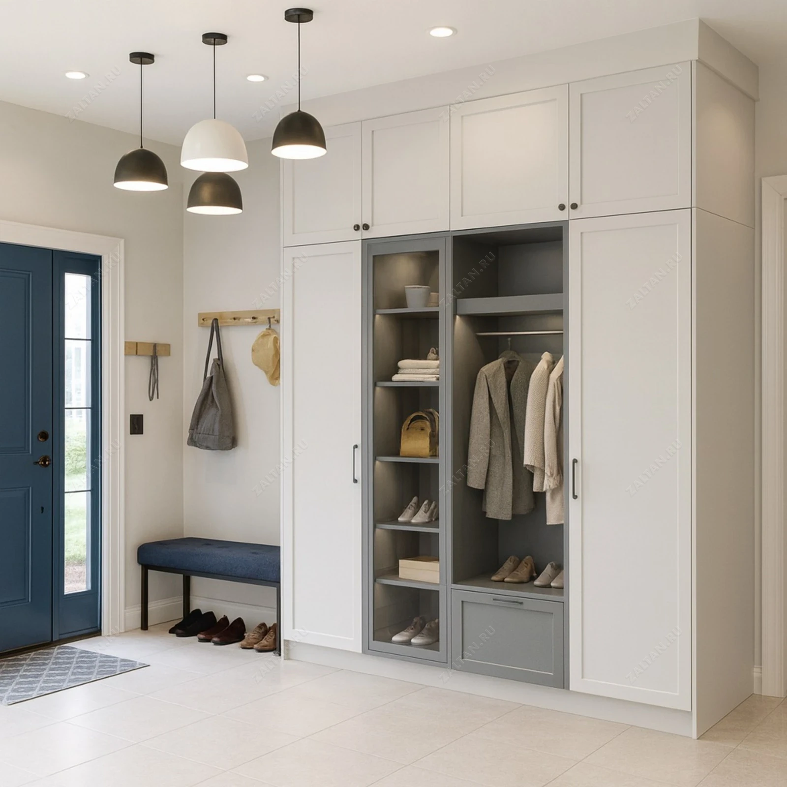 Высококлассный встроенный шкаф для прихожей, выполненный под потолок для максимального использования пространства. Центральная открытая ниша со стеллажами и штангой сочетает демонстрационную зону и удобное хранение. Верхние антресоли, выдвижной ящик и подсветка делают конструкцию функциональной.
