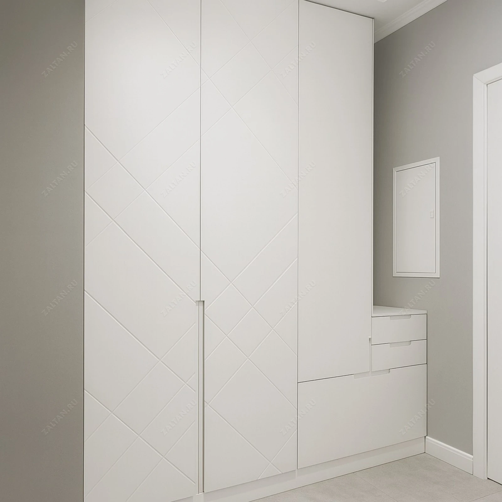 Элегантный встроенный шкаф для прихожей — решение премиум-класса под потолок. Фасады из МДФ с фрезеровкой и матовой эмалевой поверхностью создают утончённую текстуру, интегрированные ручки обеспечивают лаконичный вид. Внутри — комбинированная конфигурация полок, выдвижных ящиков и пенала для обуви и вешалок.