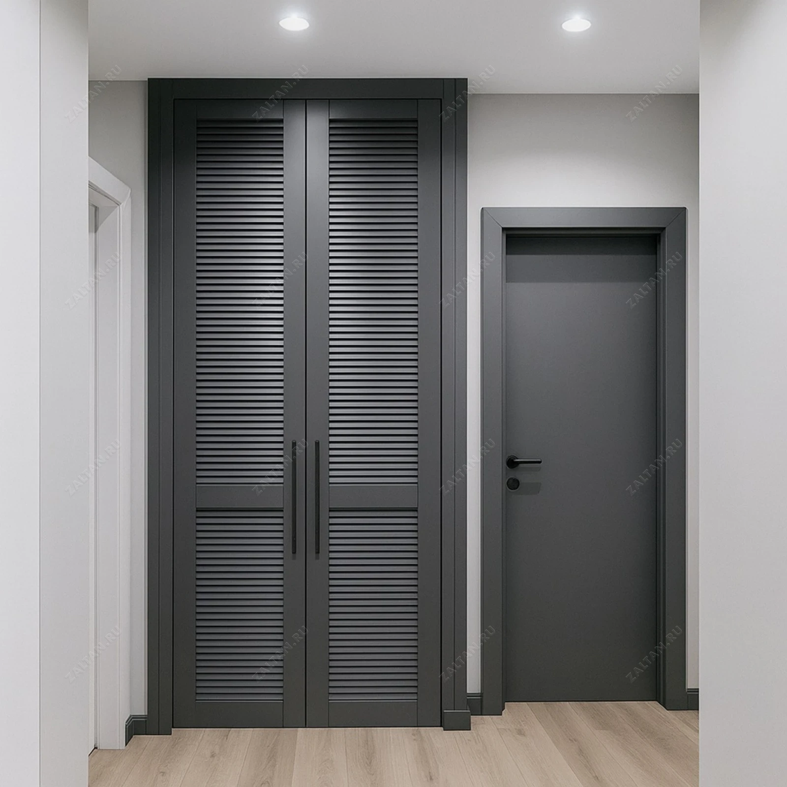 Высокий встроенный шкаф с жалюзийными дверями — решение для стильной прихожей. Корпус выполнен под потолок, фасады — MDF с матовой эмалью тёмно-серого тона. Жалюзи обеспечивают естественную вентиляцию внутри.