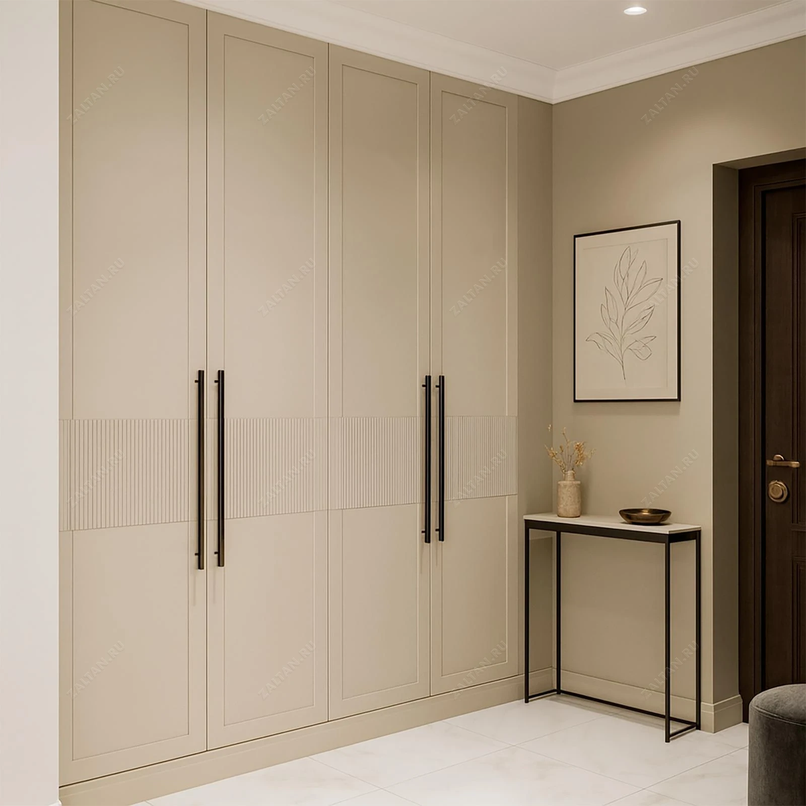 Элегантный встроенный шкаф в прихожую, выполненный в спокойной кремовой гамме. Модель сочетает лаконичный профиль дверей с декоративной реечкой по центру фасада и высокими черными ручками — решение в духе современной минималистичной классики.