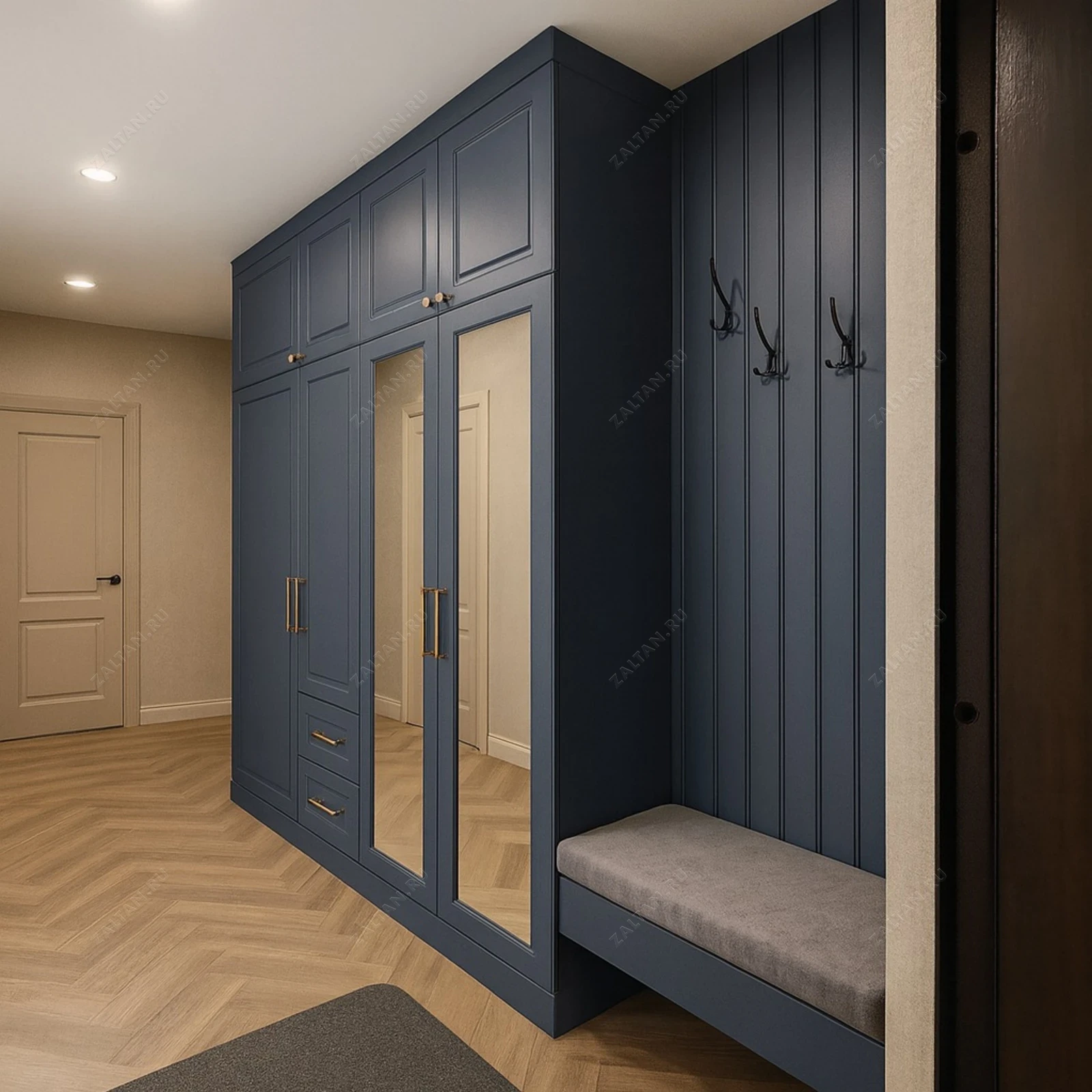 Индивидуальный встроенный шкаф-прихожая в неоклассическом стиле, выполнен из крашеного МДФ в глубокем синем оттенке с матовой фактурой. Зеркальные фасады визуально увеличивают пространство, антресоли добавляют хранение, нижние ящики обеспечивают удобную сортировку вещей.