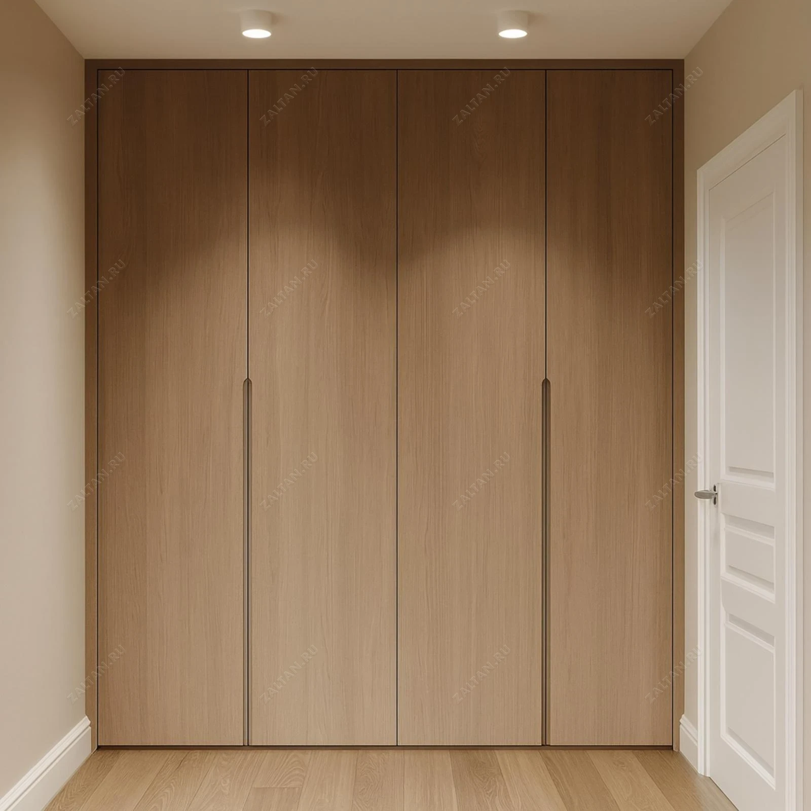Встроенный платяной шкаф до потолка в прихожую, фасад из натурального шпона дуба в теплой бежевой гамме. Минималистичный дизайн с вертикальными интегрированными ручками и ровными филёнками.