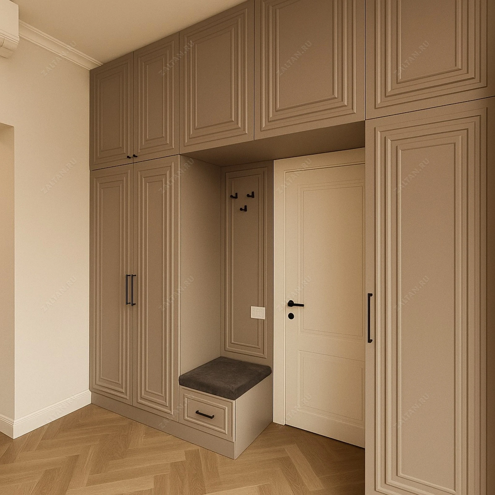 Элегантная встроенная мебель для прихожей в неоклассическом стиле: панельные фасады, просторные антресоли и удобная посадочная ниша с выдвижным ящиком. Изготовим по индивидуальным размерам с акцентом на премиальное исполнение и долговечную фурнитуру.