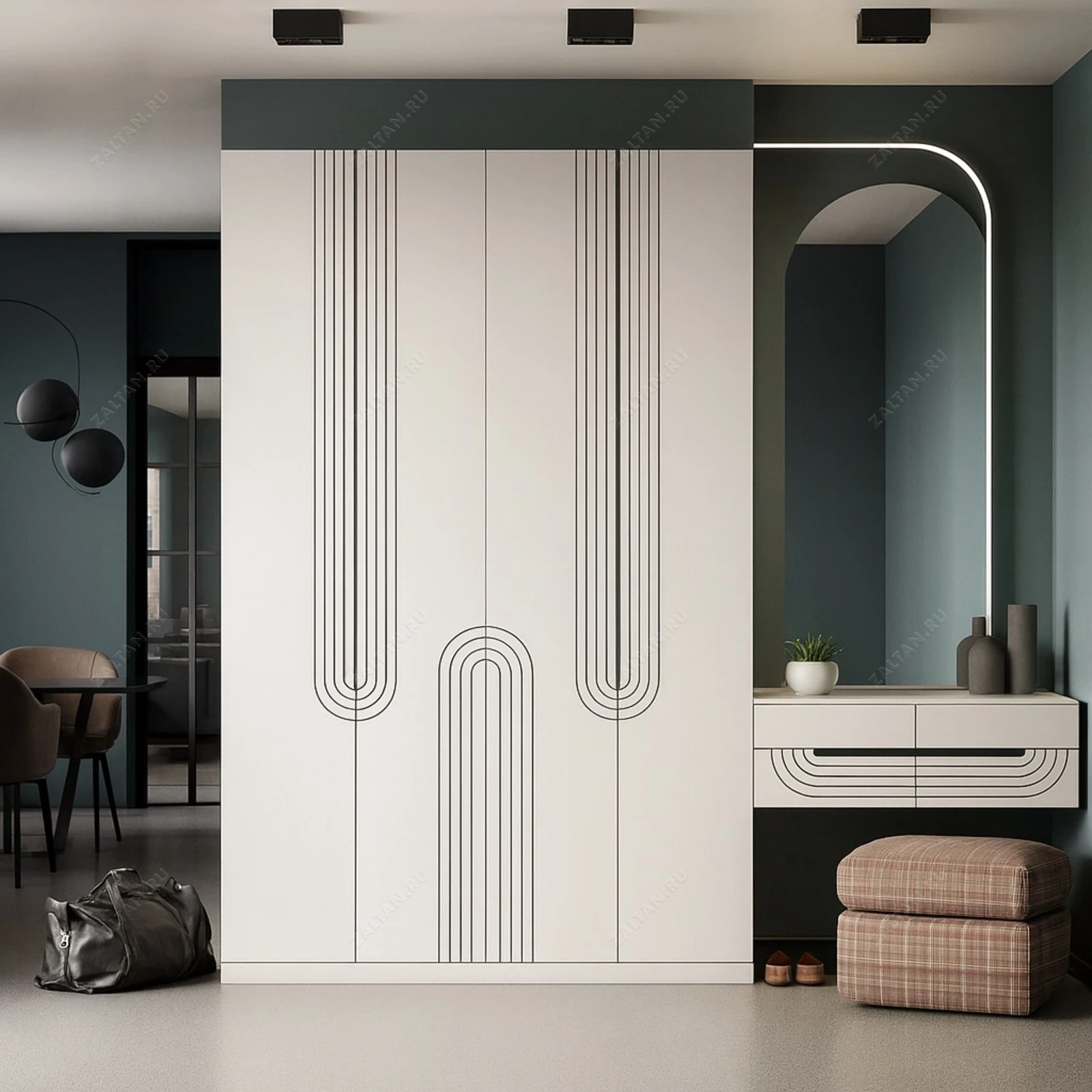 Элегантный встроенный шкаф для прихожей с фрезерованным рисунком на фасадах. Выполнен в светлой матовой отделке, без видимых ручек — современный минималистичный образ для городской квартиры.