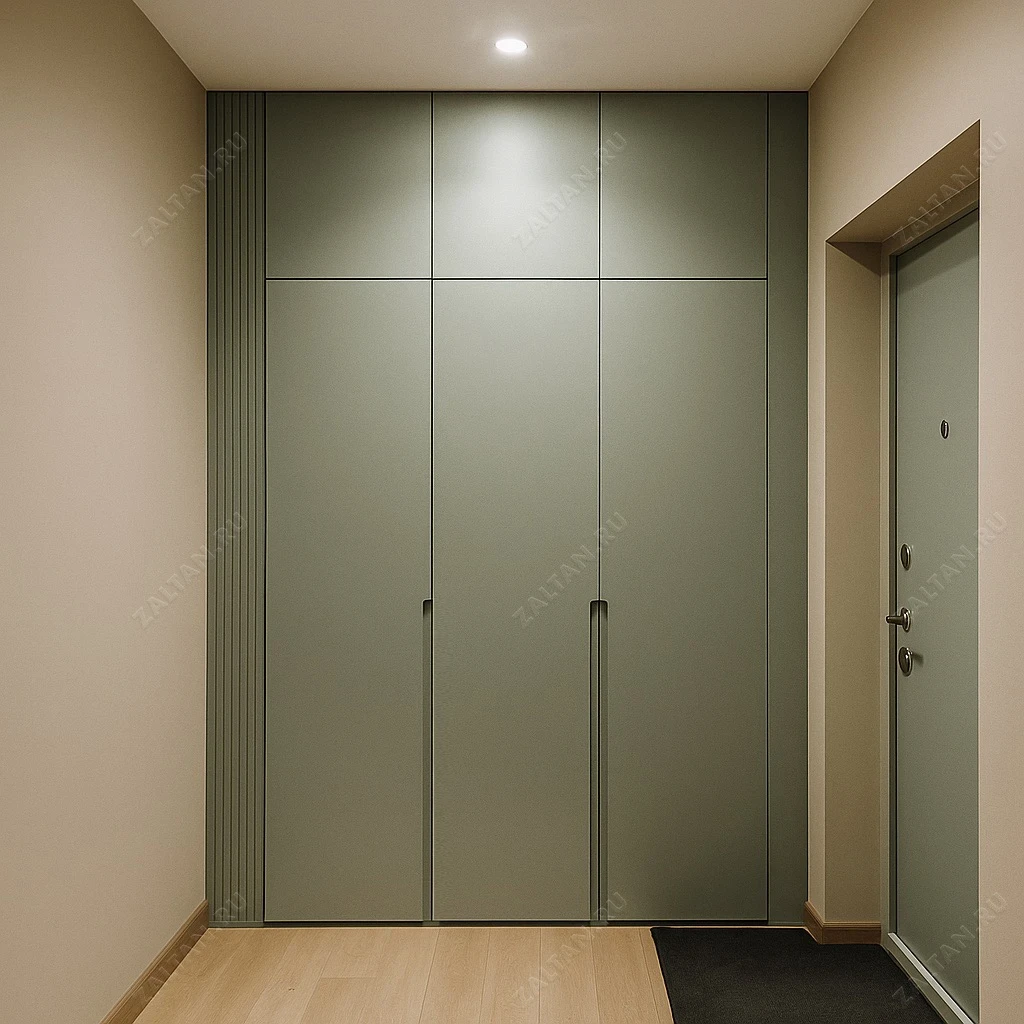 Элегантный встроенный шкаф под потолок для прихожей в матовом зелёном оттенке. Минималистичная фасадная линия с интегрированными ручками и вертикальной реечной панелью — решение для аккуратного и тихого интерьера.