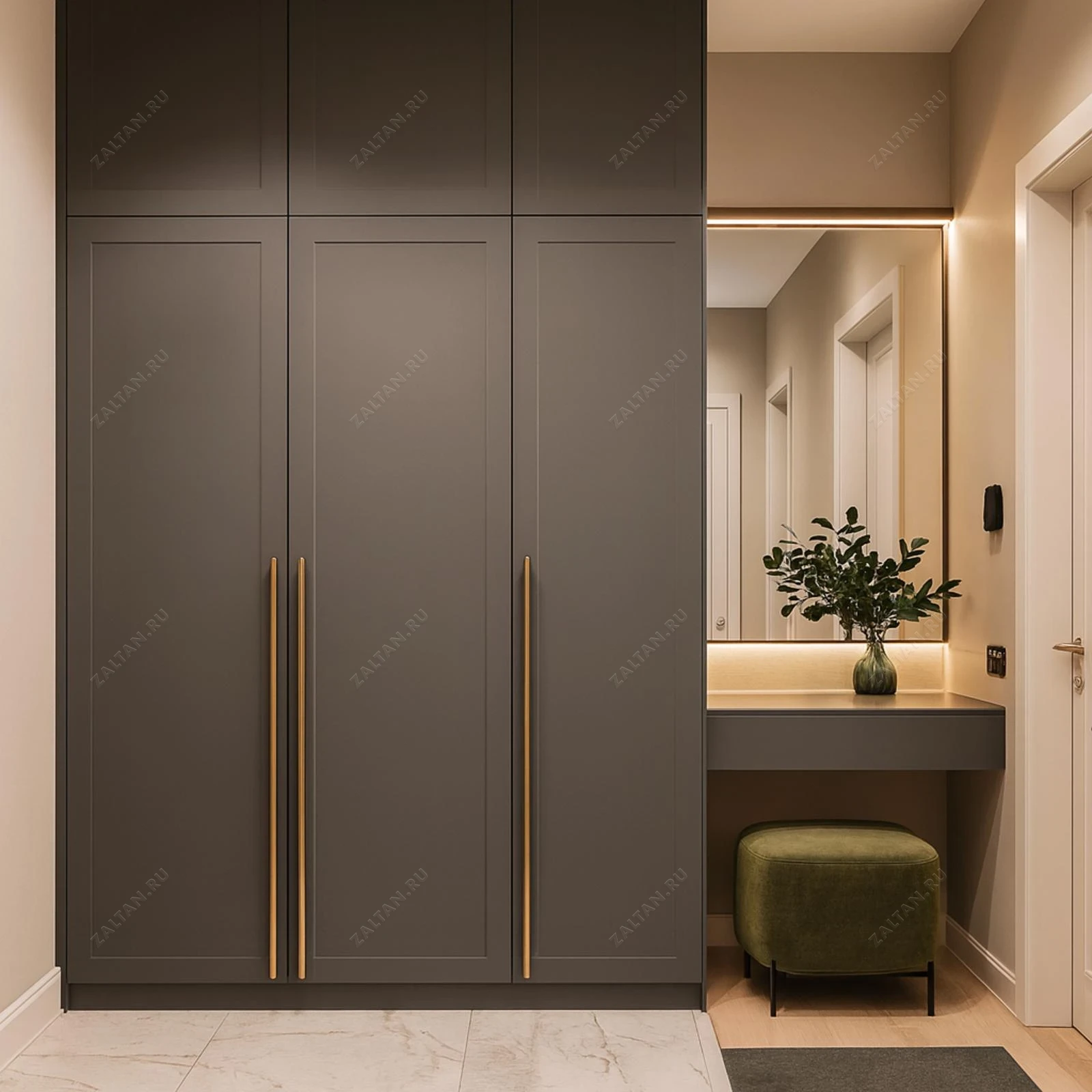 Элегантный встроенный шкаф для прихожей, изготовленный по индивидуальному проекту. Матовый фасад с фрезерованной рамкой и удлинёнными золотистыми ручками подчёркивает премиальный характер изделия. Верхние антресоли до потолка и скрытые секции обеспечивают максимальную вместимость.