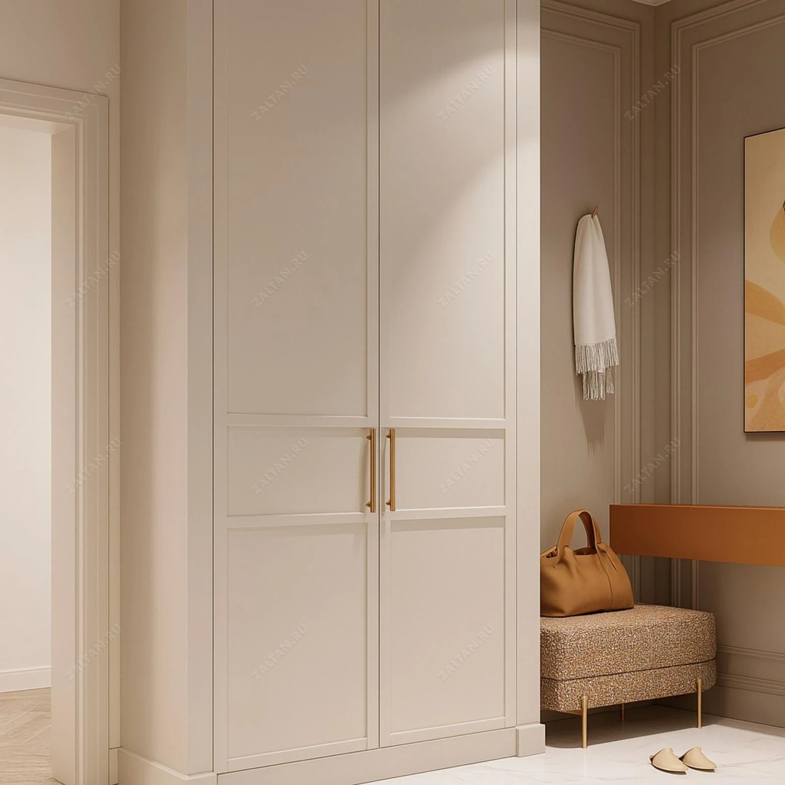 Элегантный встроенный шкаф в прихожую в неоклассическом стиле. Корпус и филенчатые фасады — окрашенный МДФ с матовой эмалью, фурнитура латунного тона. Выполняется под любые размеры и планировку.