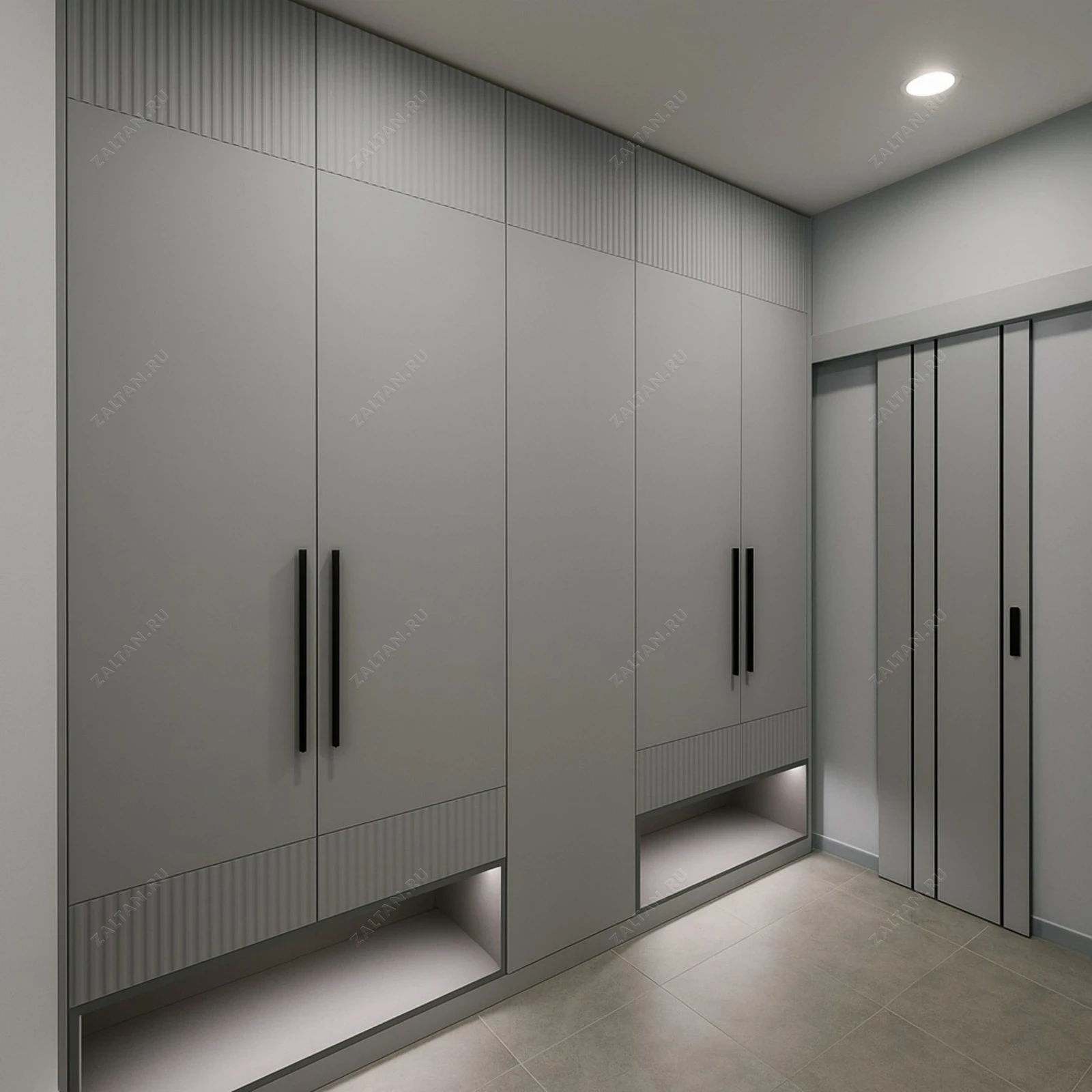 Встроенный шкаф для прихожей в минималистичном стиле. Матовые МДФ-фасады с реечной фрезеровкой, длинные черные алюминиевые ручки, нижняя ниша с мягкой подсветкой — функционально и аккуратно. Конструкция до потолка, глубокие секции под верхнюю одежду и съемные полки для обуви.
