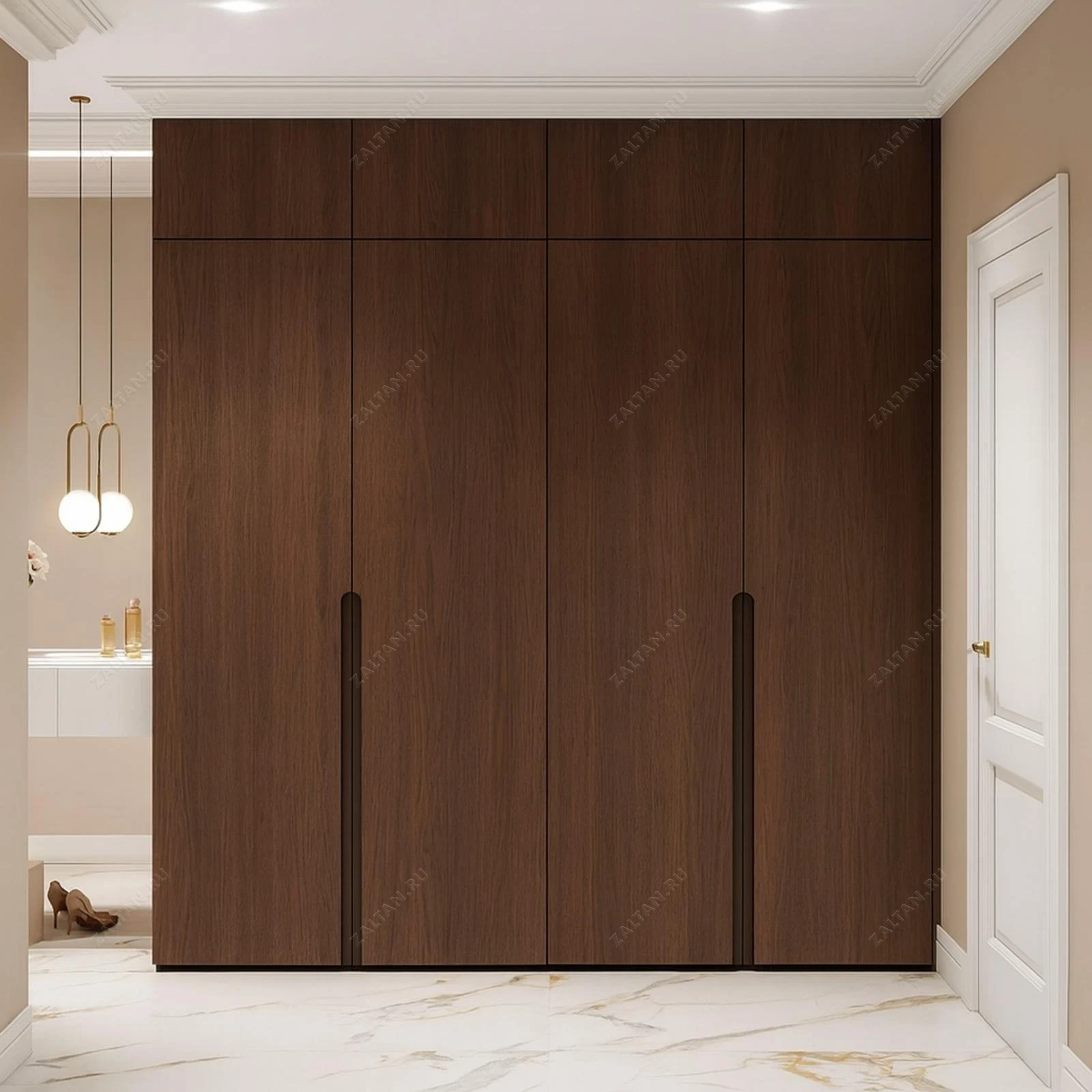 Элегантный встроенный шкаф из тёмного шпона венге для прихожей. Лаконичный минималистичный фасад с интегрированными вертикальными ручками, верхние антресоли и скрытая база создают цельную поверхность от пола до потолка.